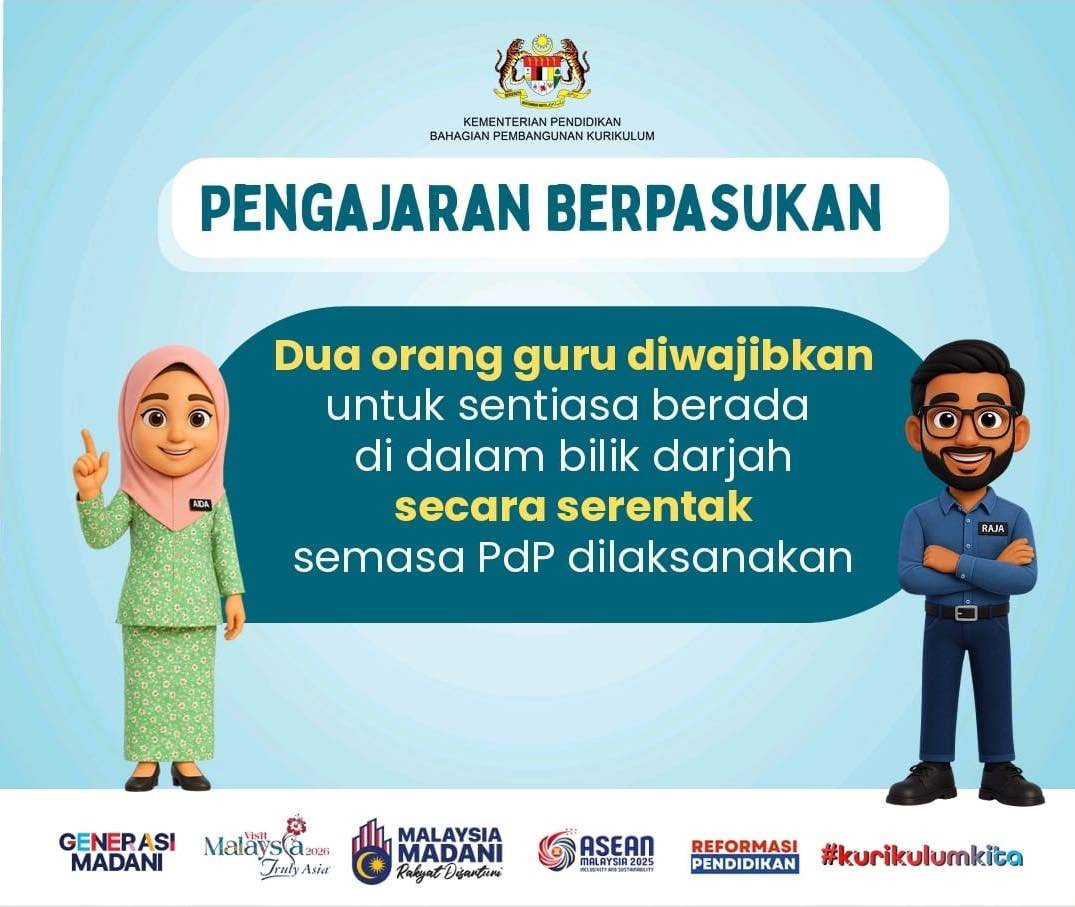 Dua guru diwajibkan berada di dalam kelas semasa PdP dijalankan.