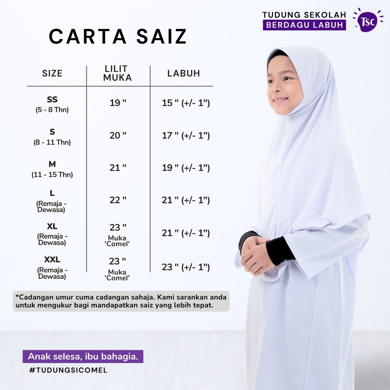 TudungSiComel sentiasa menitikberatkan kualiti dan keselesaan setiap rekaan, terutama untuk anak kecil yang aktif. Fabrik yang digunakan bukan biasa-biasa. Ia adalah Lycra Korea Sejuk yang terkenal lembut, ringan dan tidak panas walaupun dipakai dari pagi sampai balik sekolah.