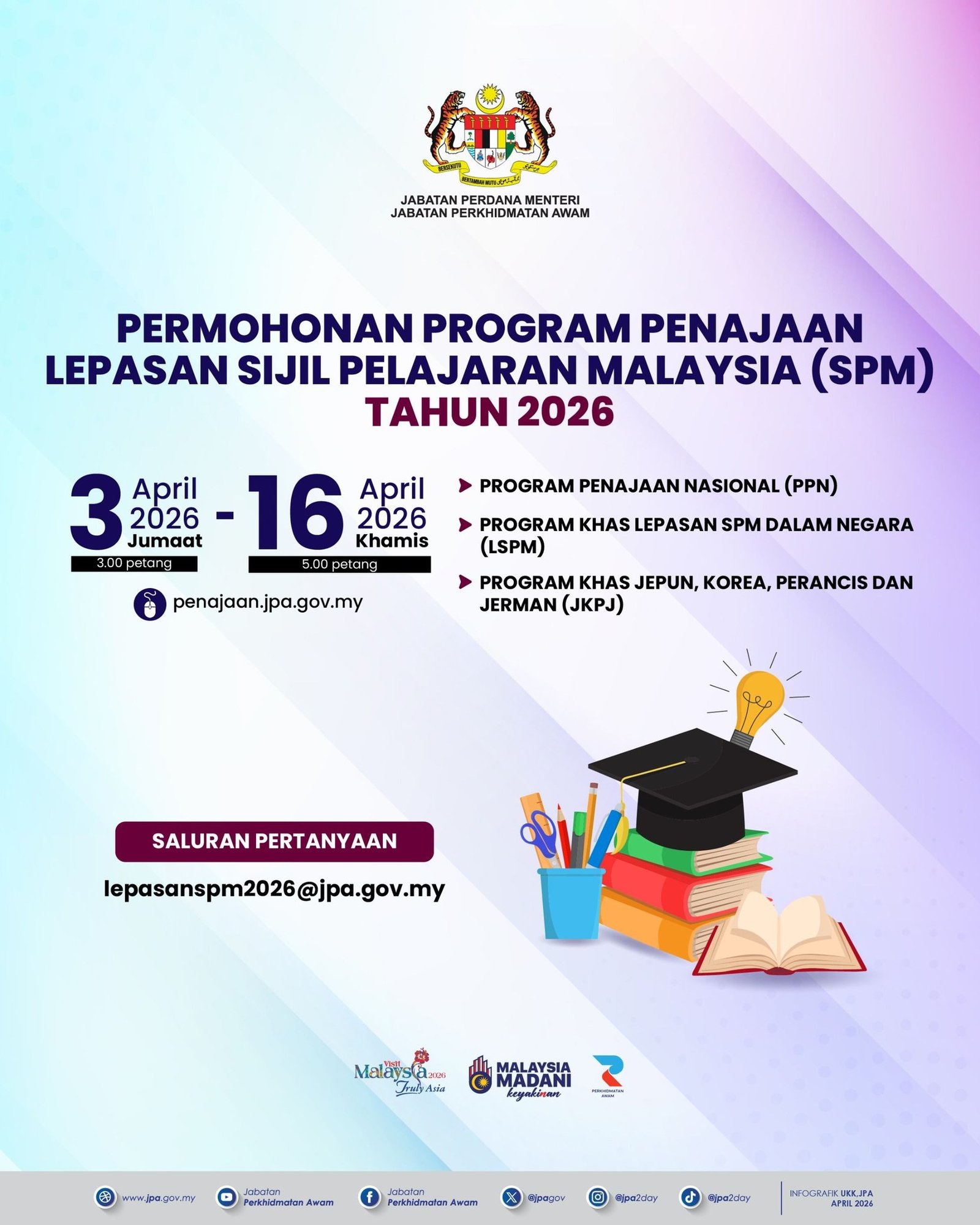 Permohonan Program Penajaan Lepasan SPM 2026 JPA tarikh 3 April hingga 16 April 2026