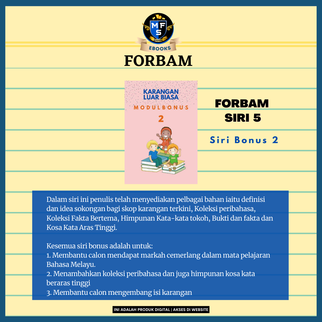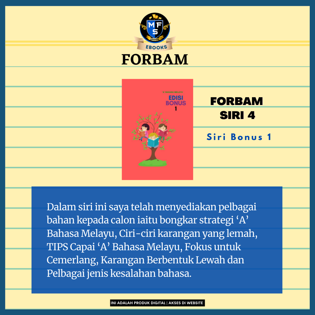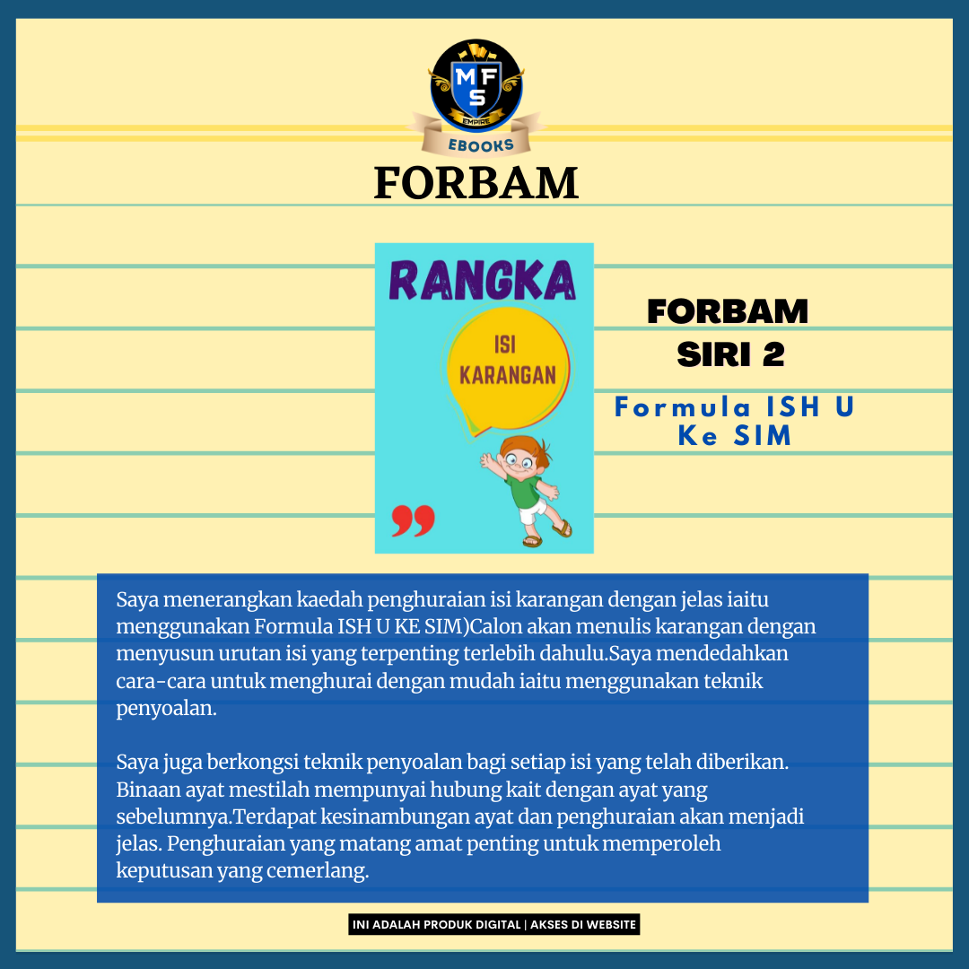 Ebook Forbam ini dihasilkan untuk memastikan pelajar didedahkan dengan pelbagai teknik membina karangan cemerlang.