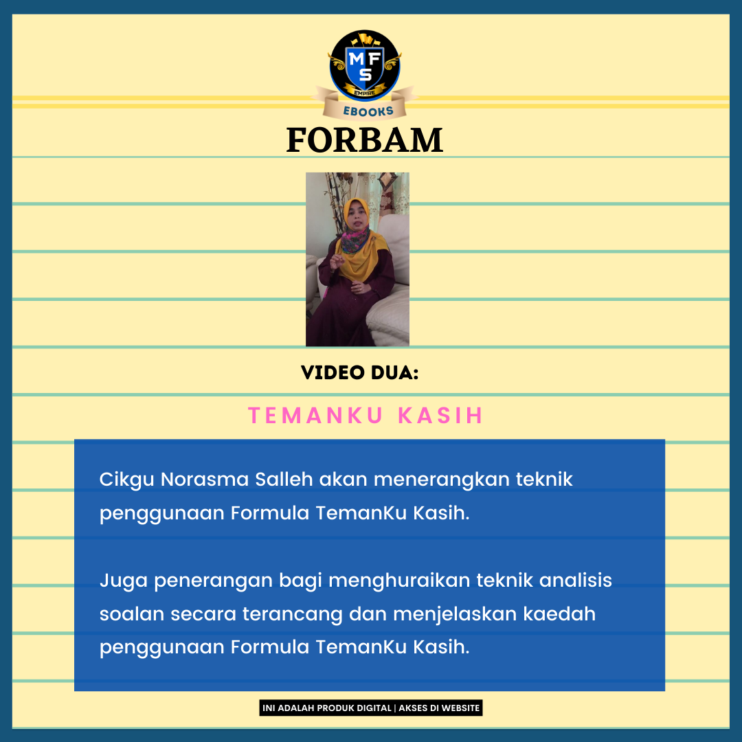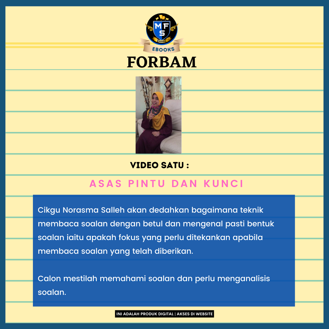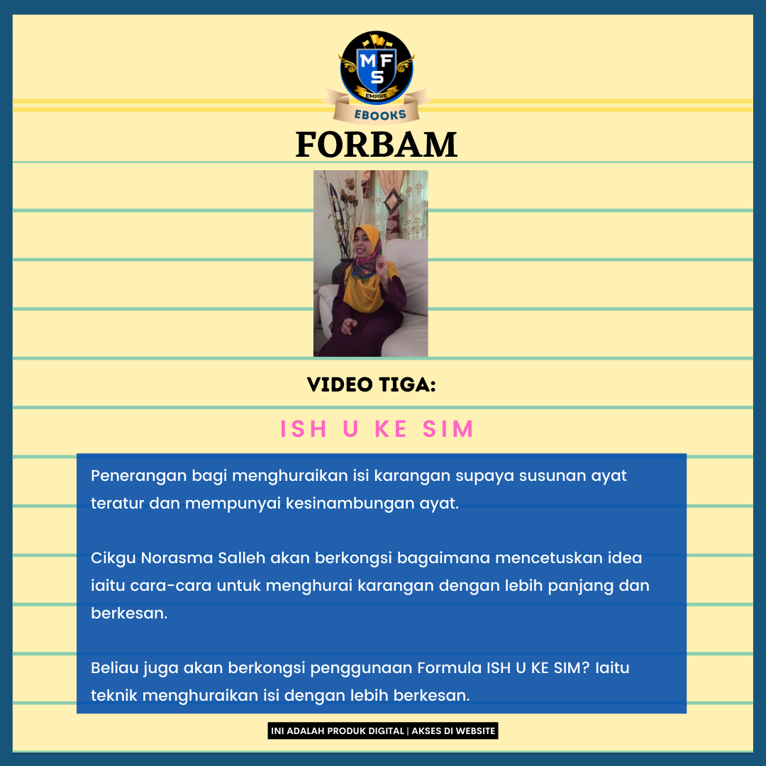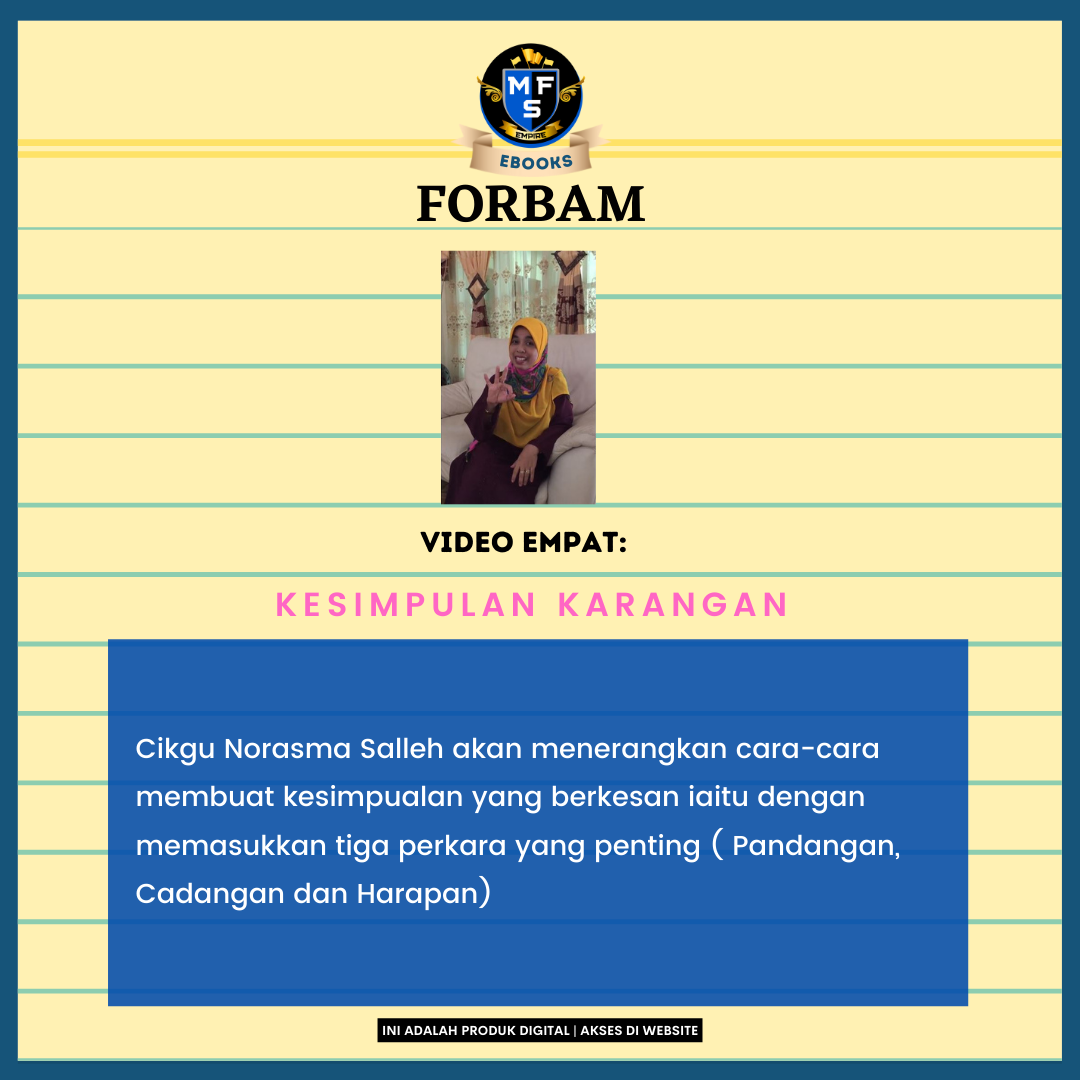 Ebook Forbam ini dihasilkan untuk memastikan pelajar didedahkan dengan pelbagai teknik membina karangan cemerlang.