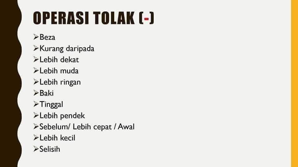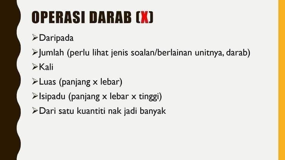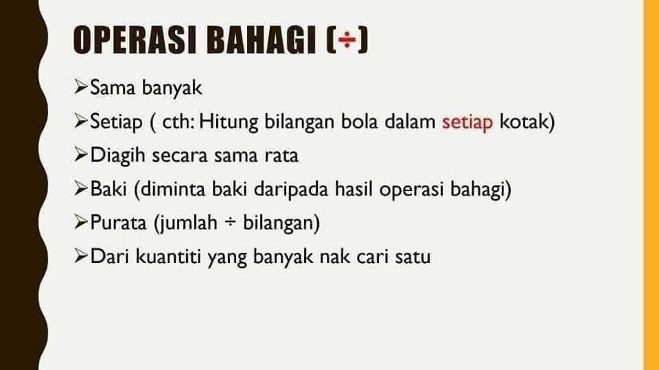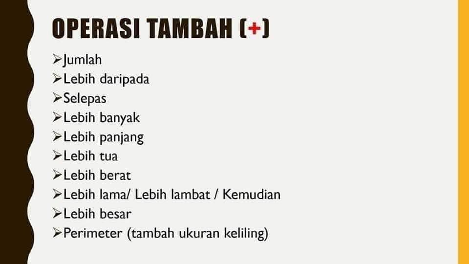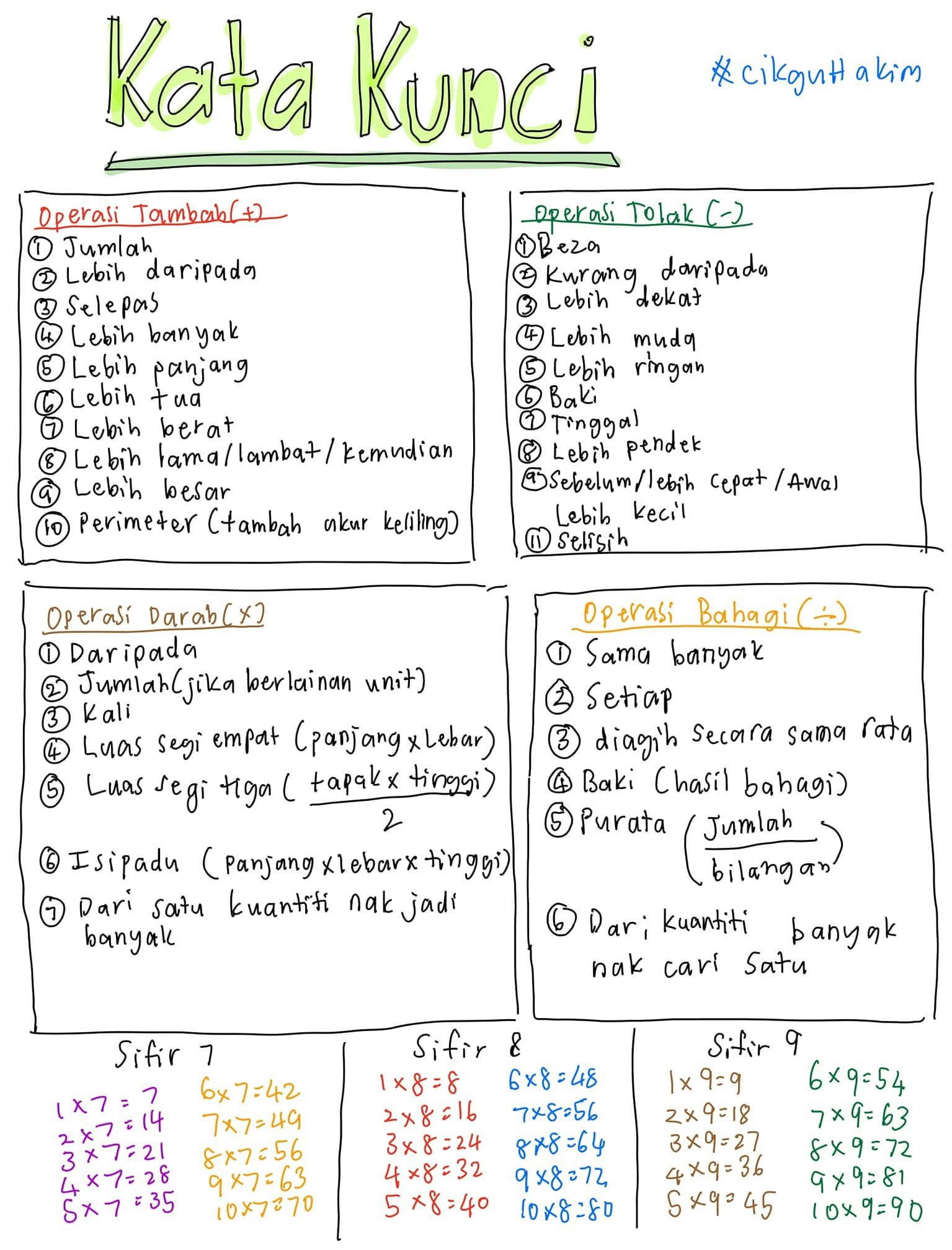 Nota ini membantu mengenali ‘Kata Kunci’ dalam soalan yang memberitahu operasi matematik yang betul. Suruh pelajar baca dan hafal! InsyaAllah, ia sangat membantu.