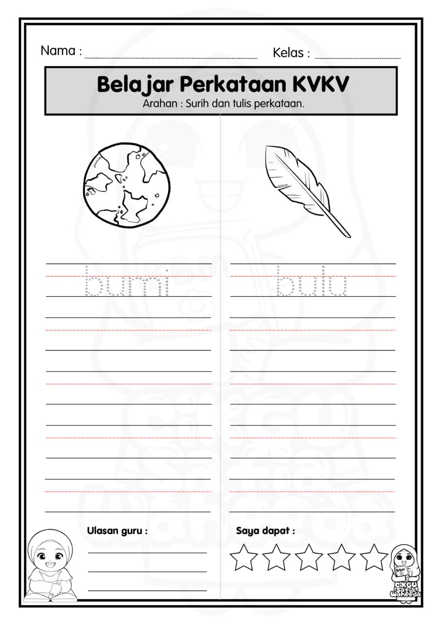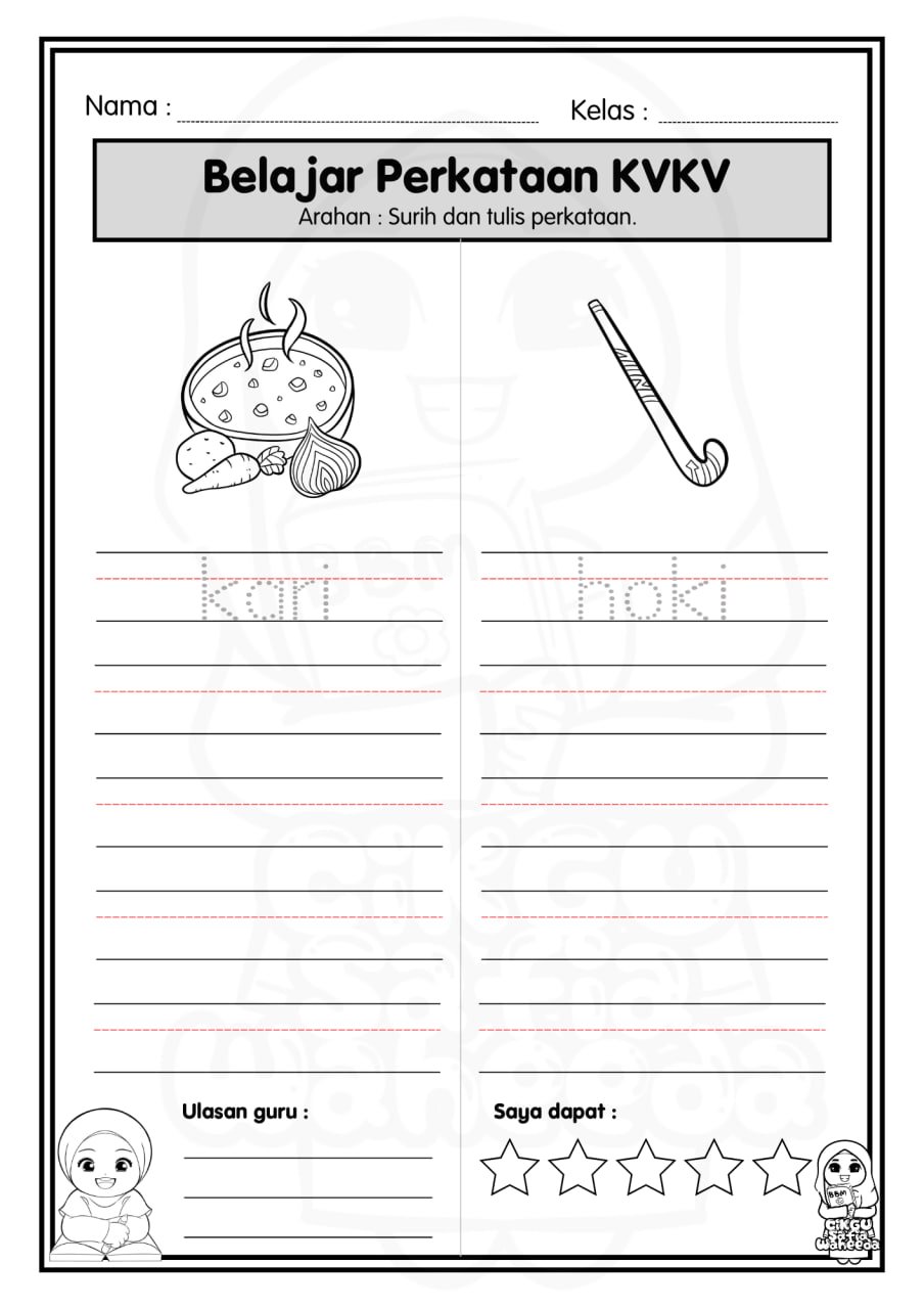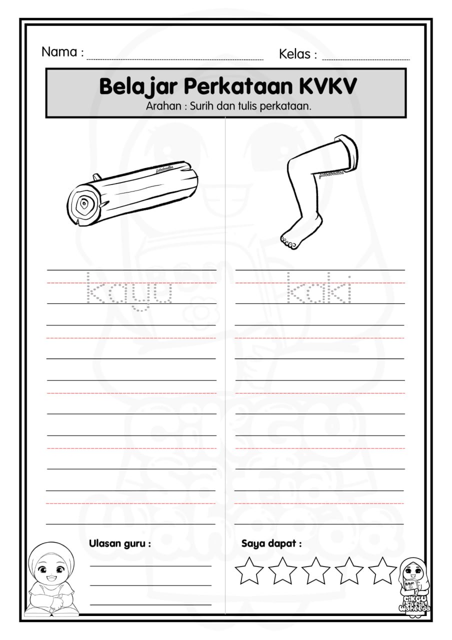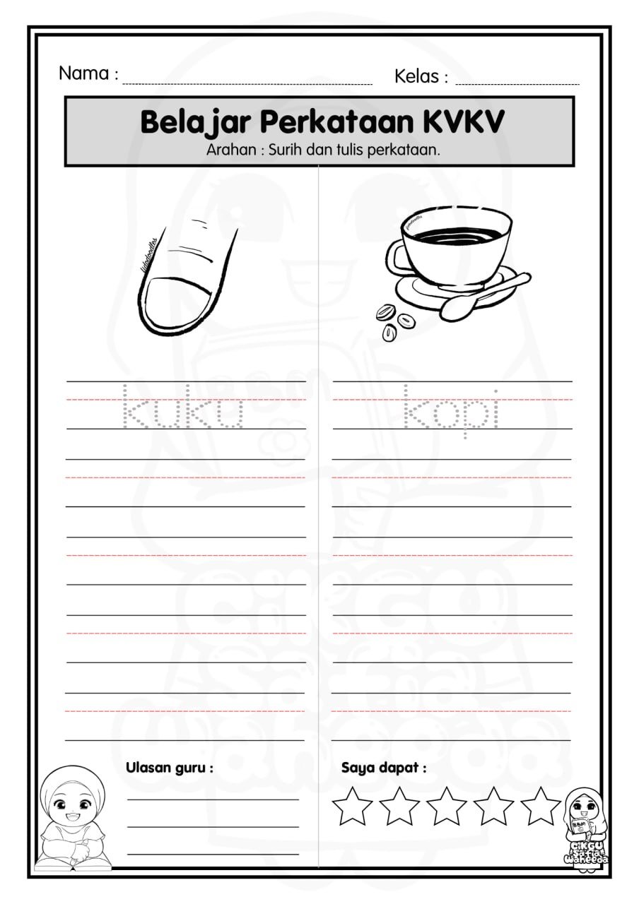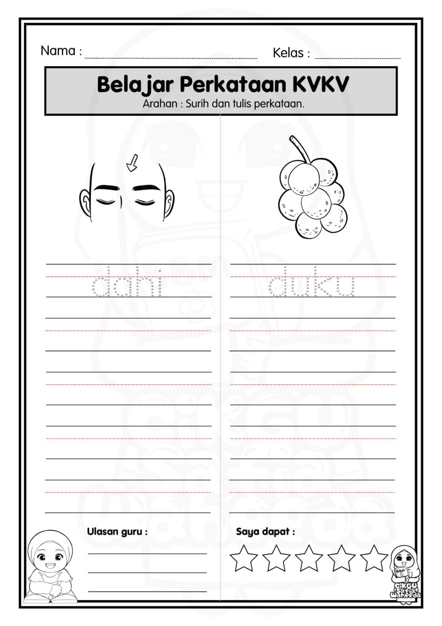 poster lembaran kerja kvkv 55 halaman percuma surih dan tulis bahasa melayu untuk murid prasekolah dan tahun 1