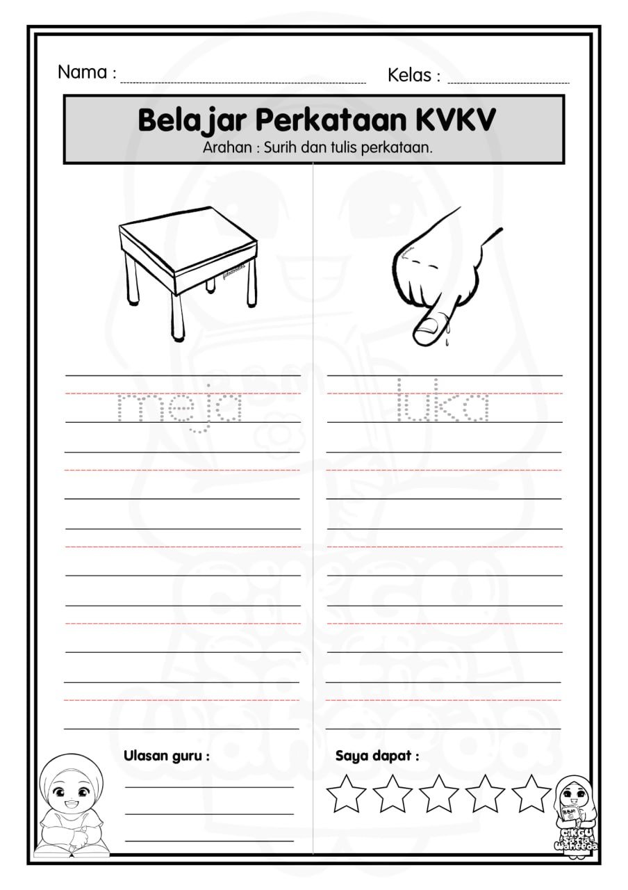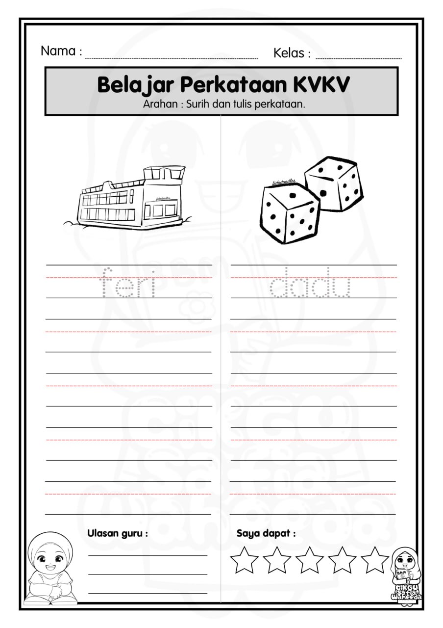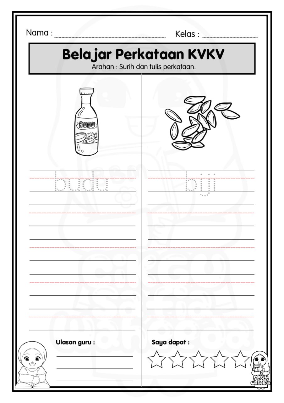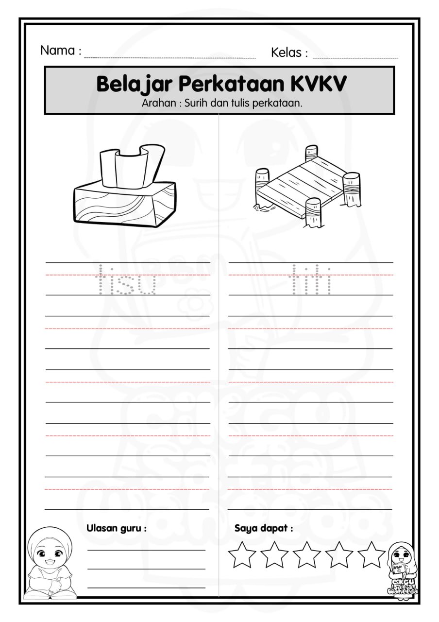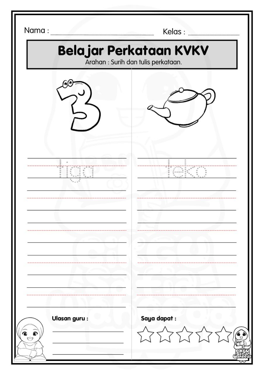 poster lembaran kerja kvkv 55 halaman percuma surih dan tulis bahasa melayu untuk murid prasekolah dan tahun 1