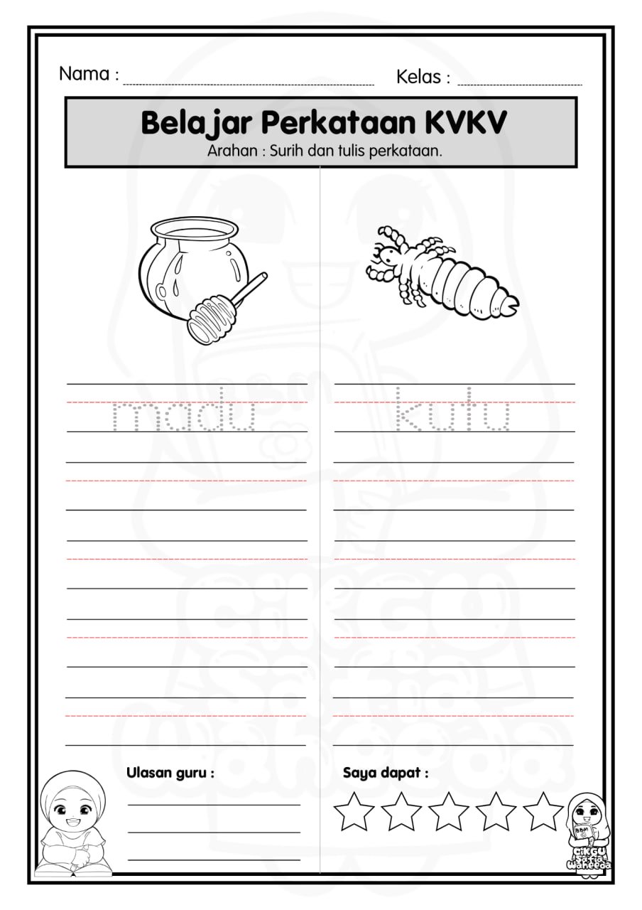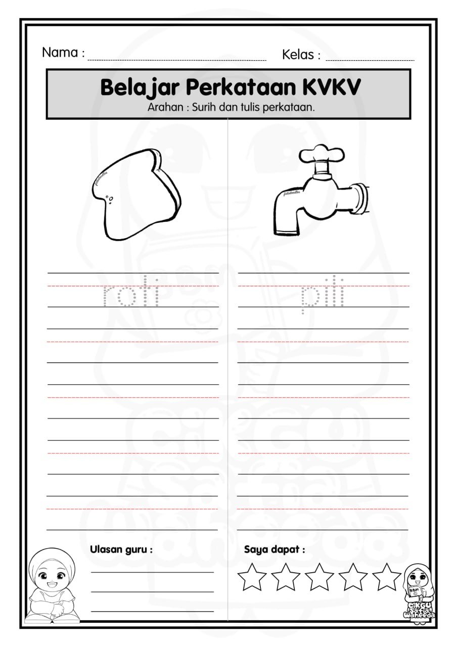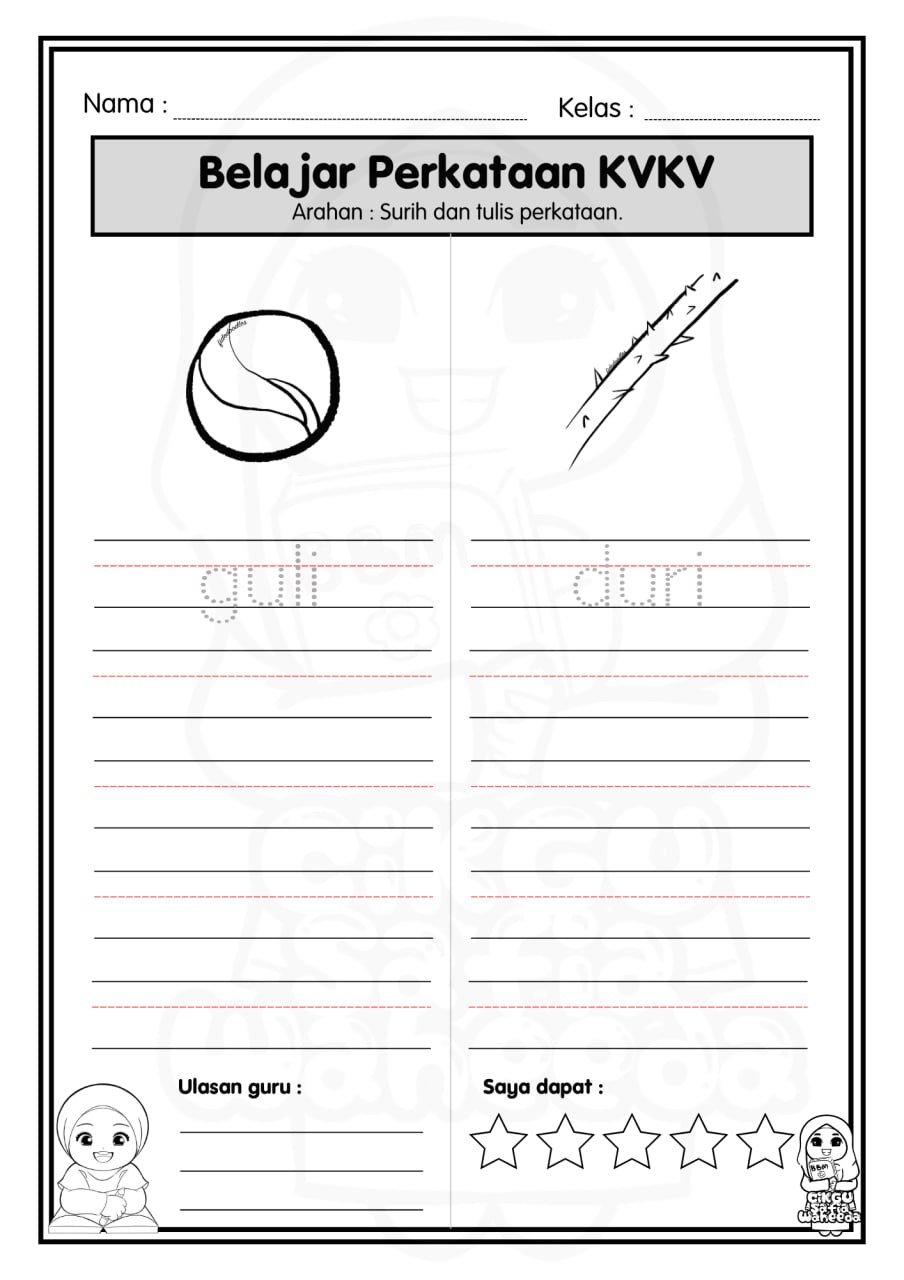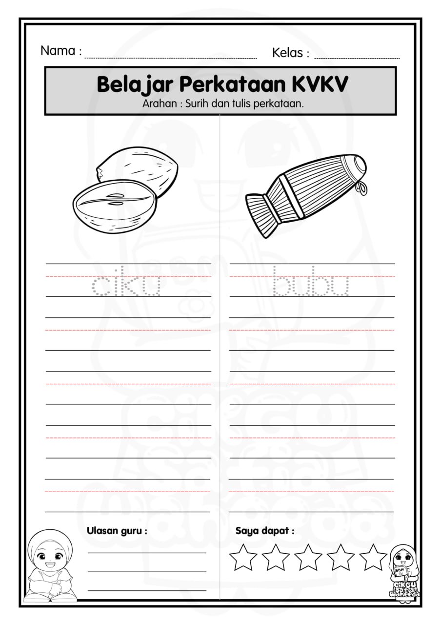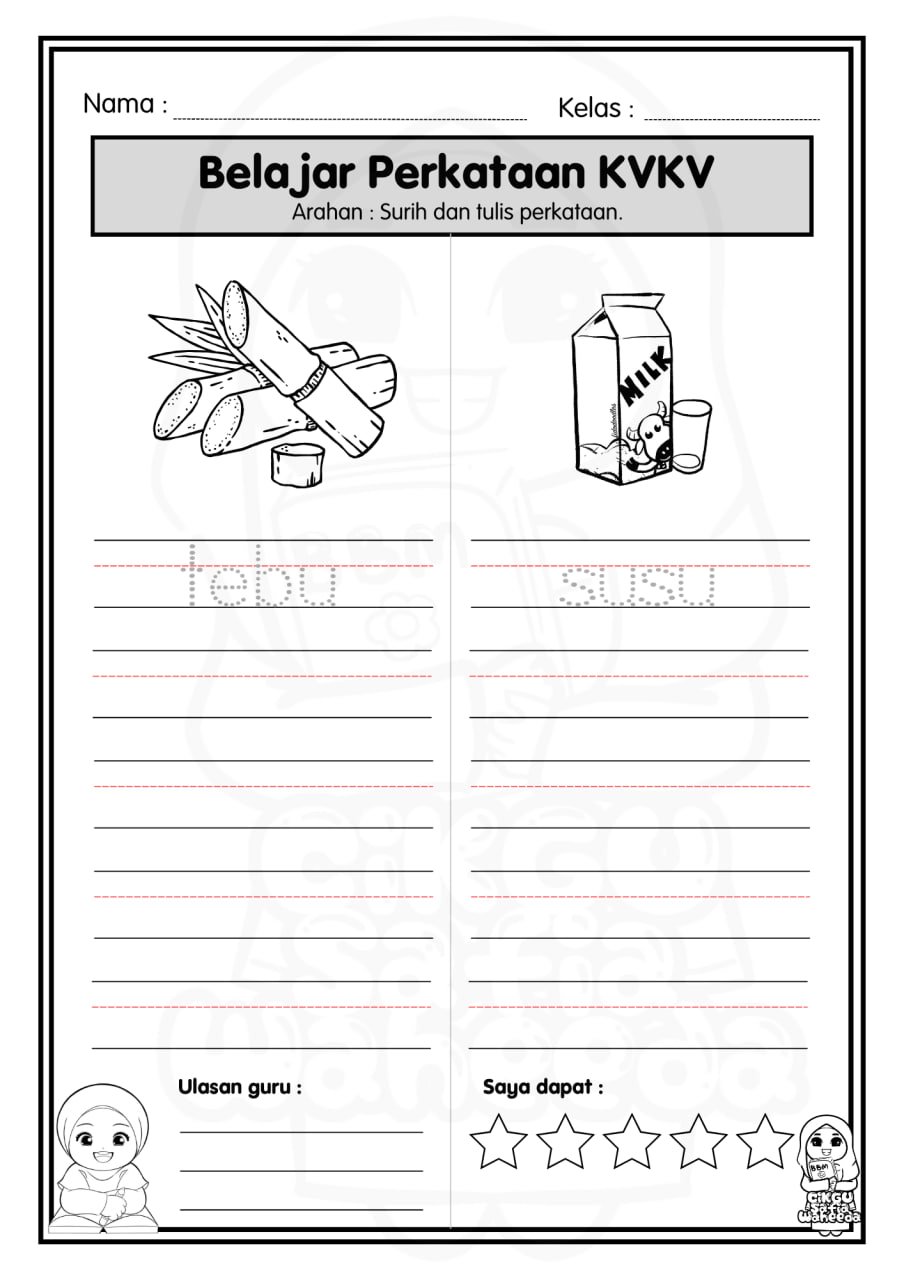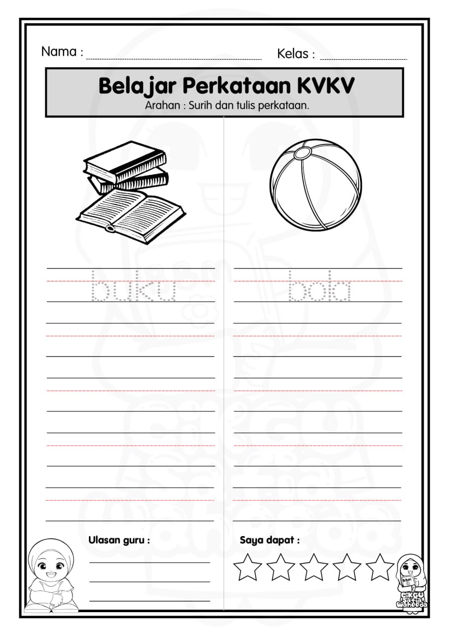 poster lembaran kerja kvkv 55 halaman percuma surih dan tulis bahasa melayu untuk murid prasekolah dan tahun 1