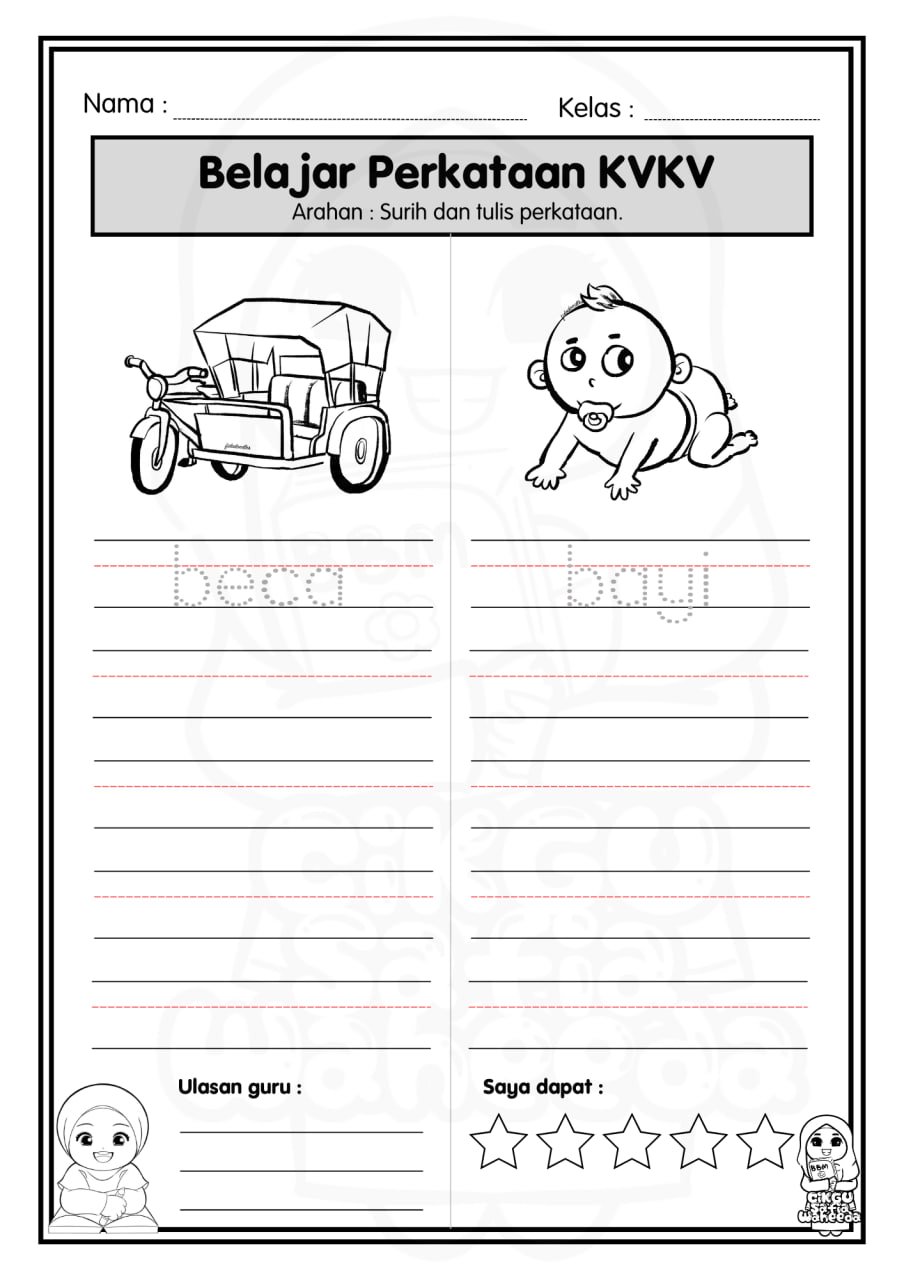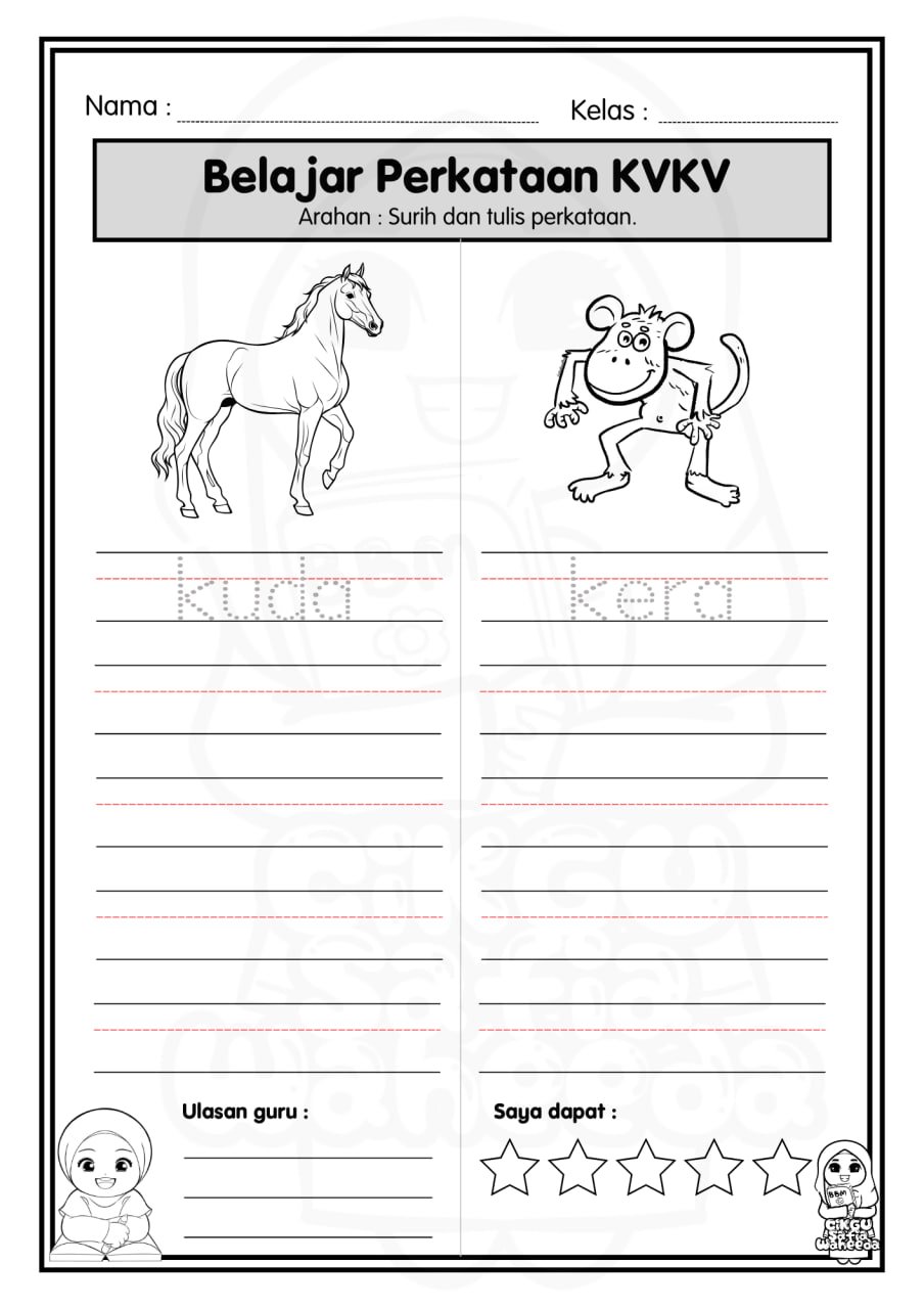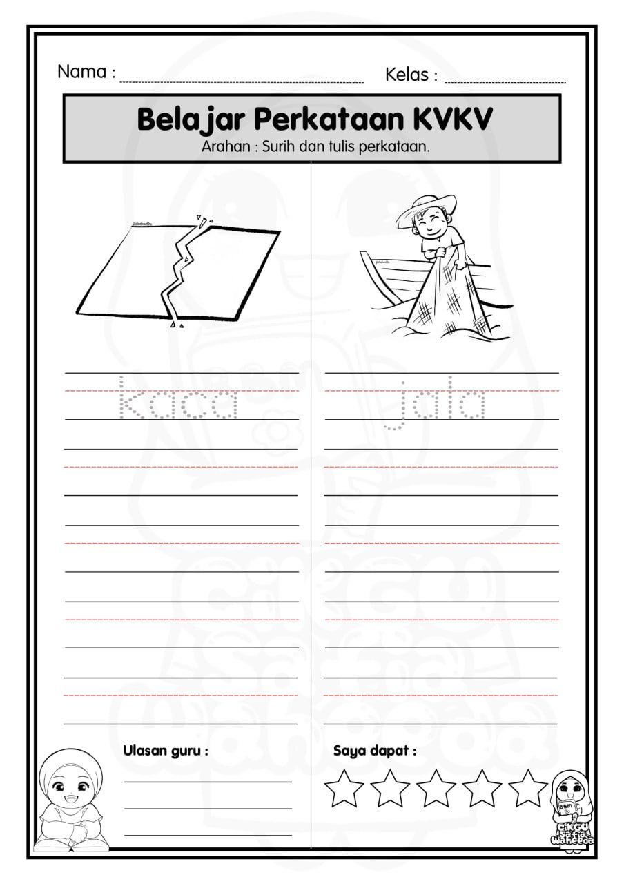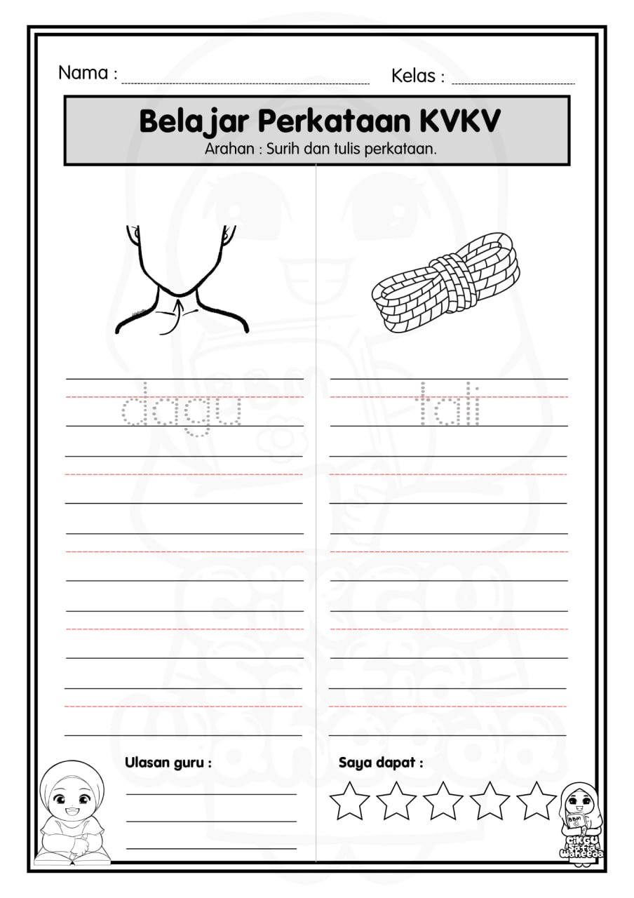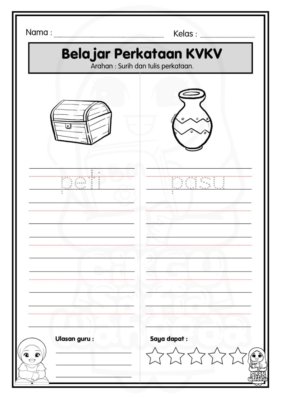 poster lembaran kerja kvkv 55 halaman percuma surih dan tulis bahasa melayu untuk murid prasekolah dan tahun 1