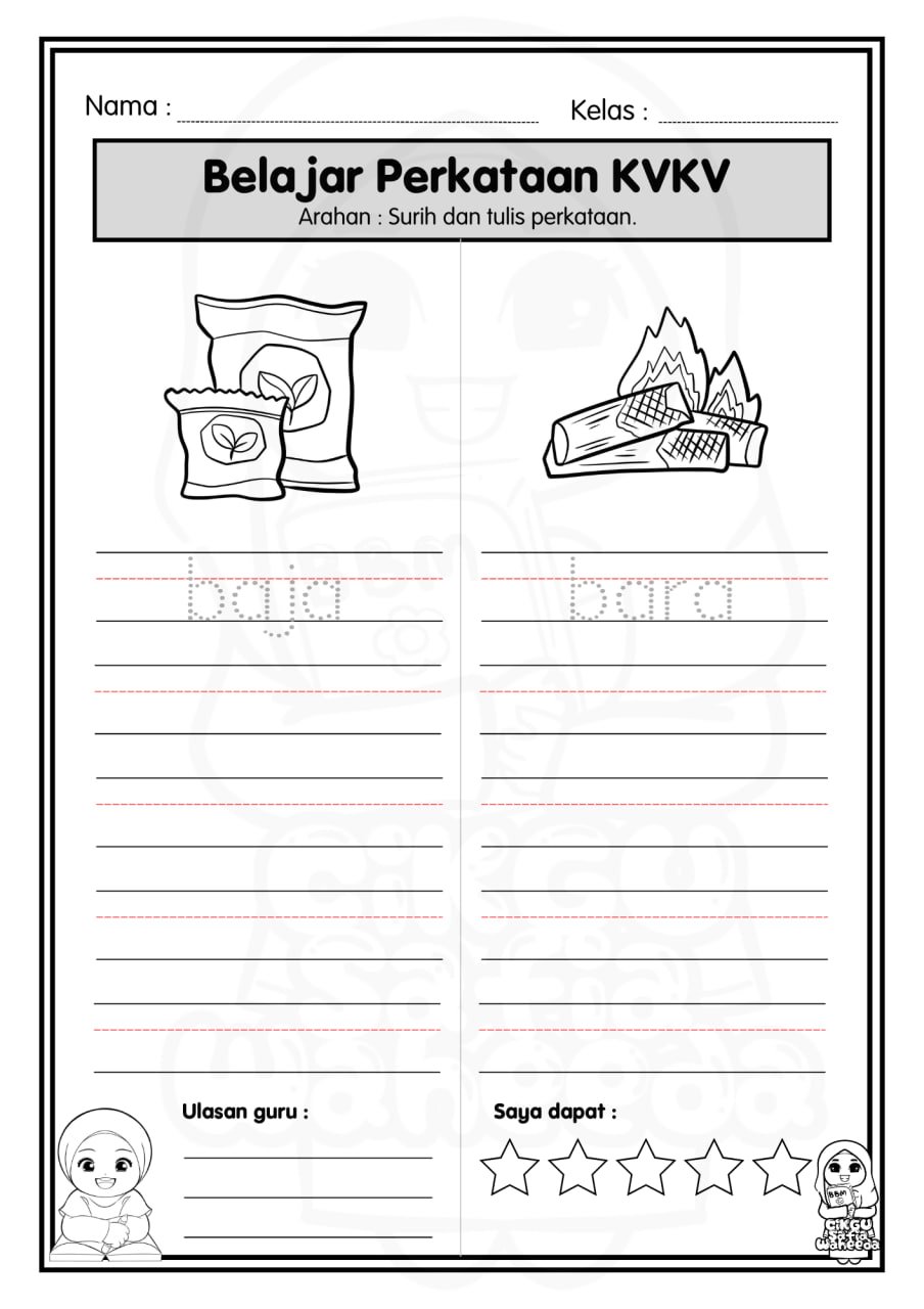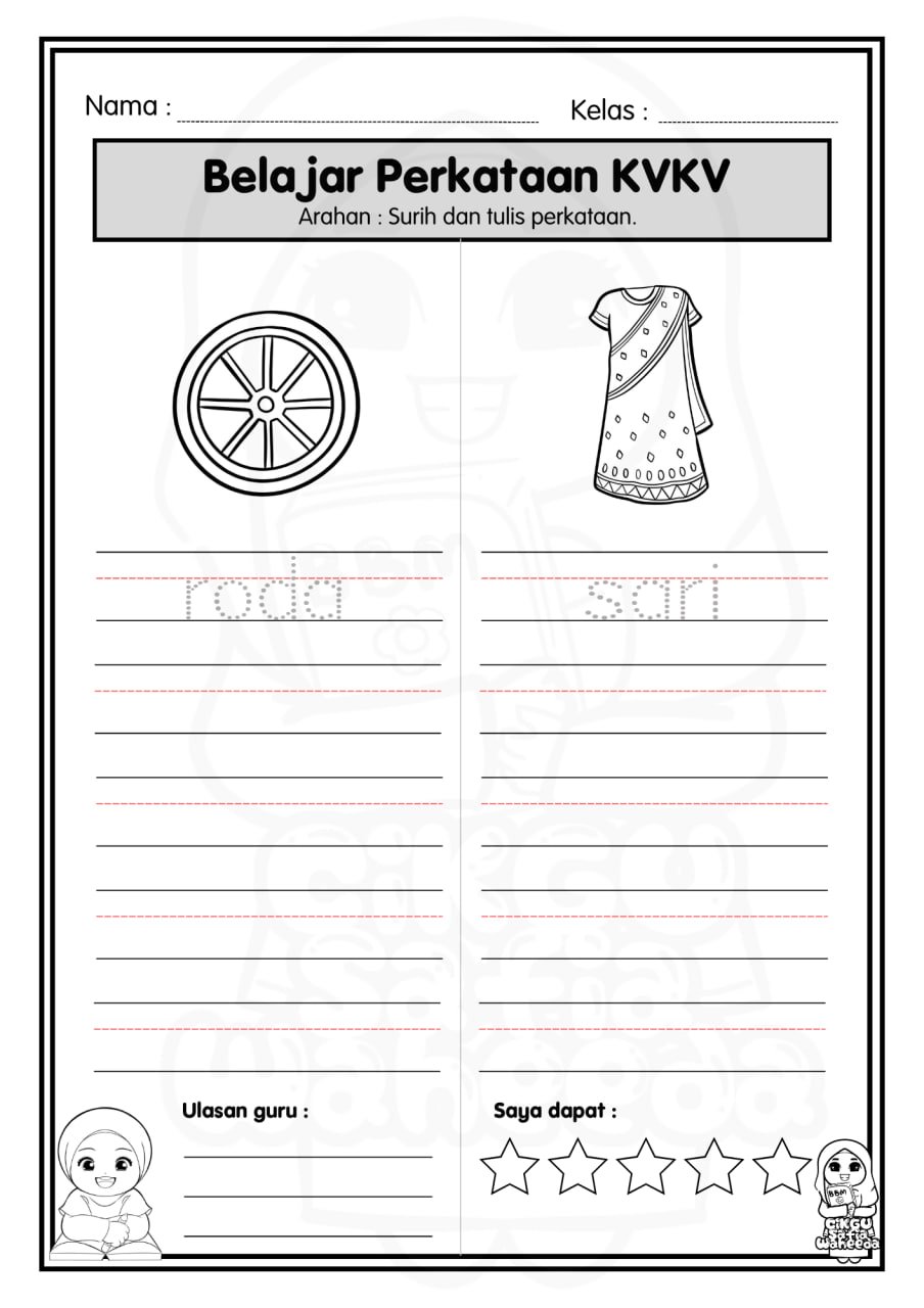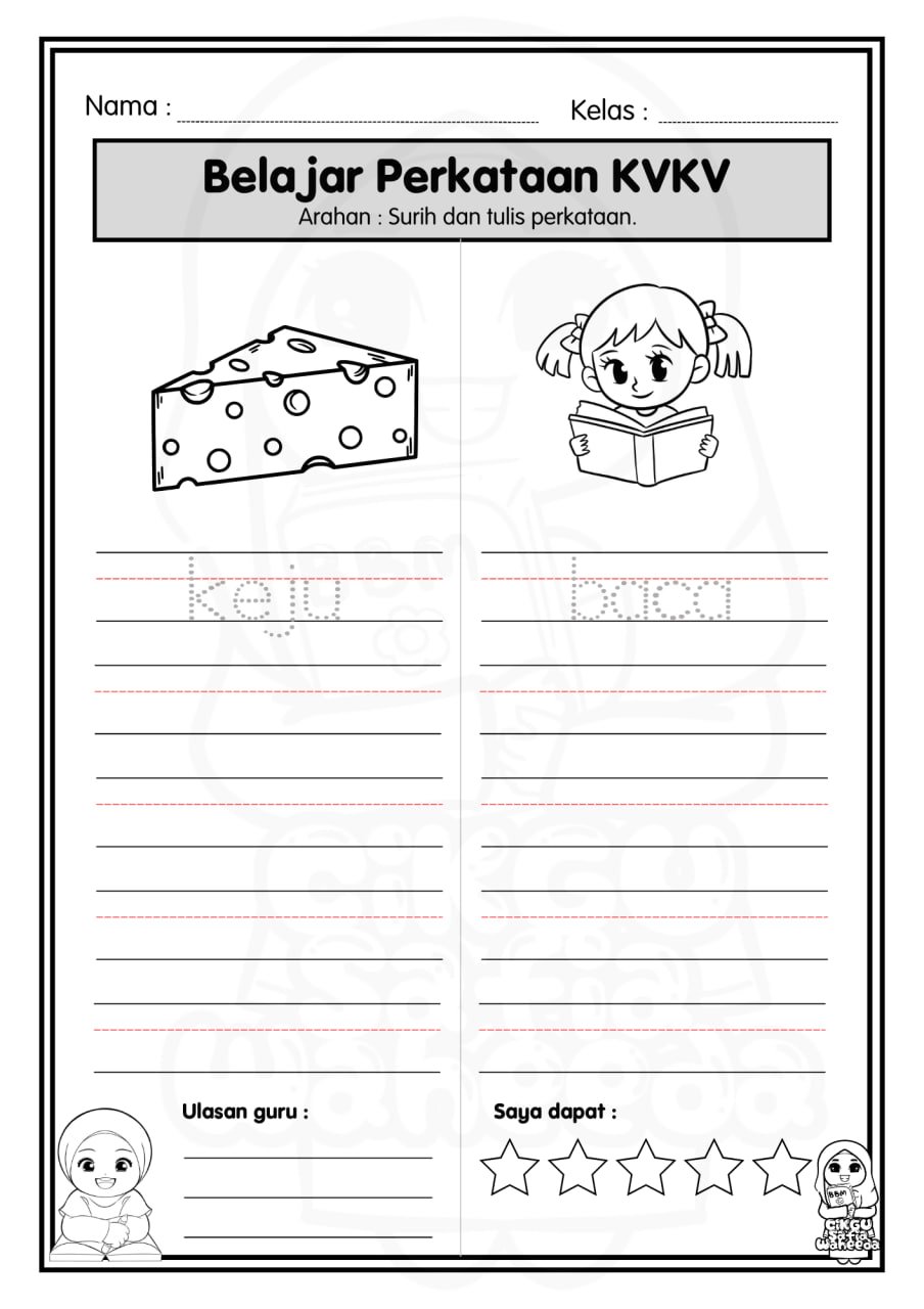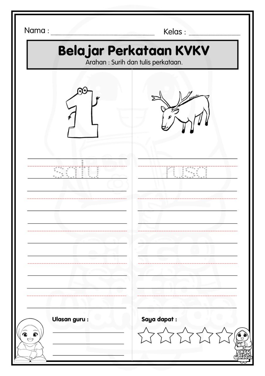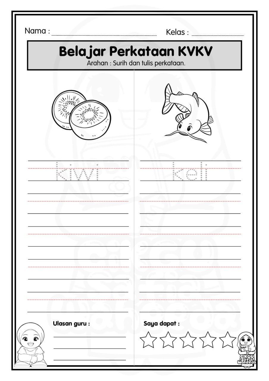 poster lembaran kerja kvkv 55 halaman percuma surih dan tulis bahasa melayu untuk murid prasekolah dan tahun 1