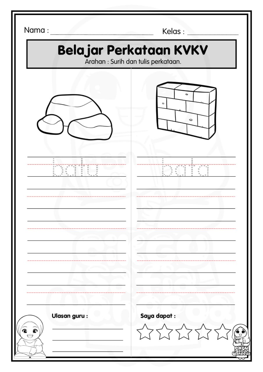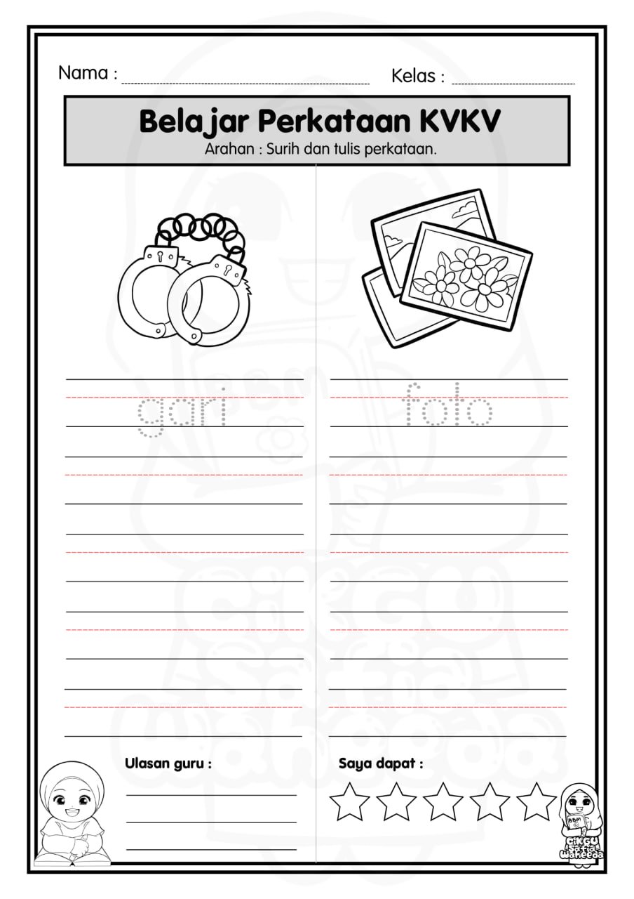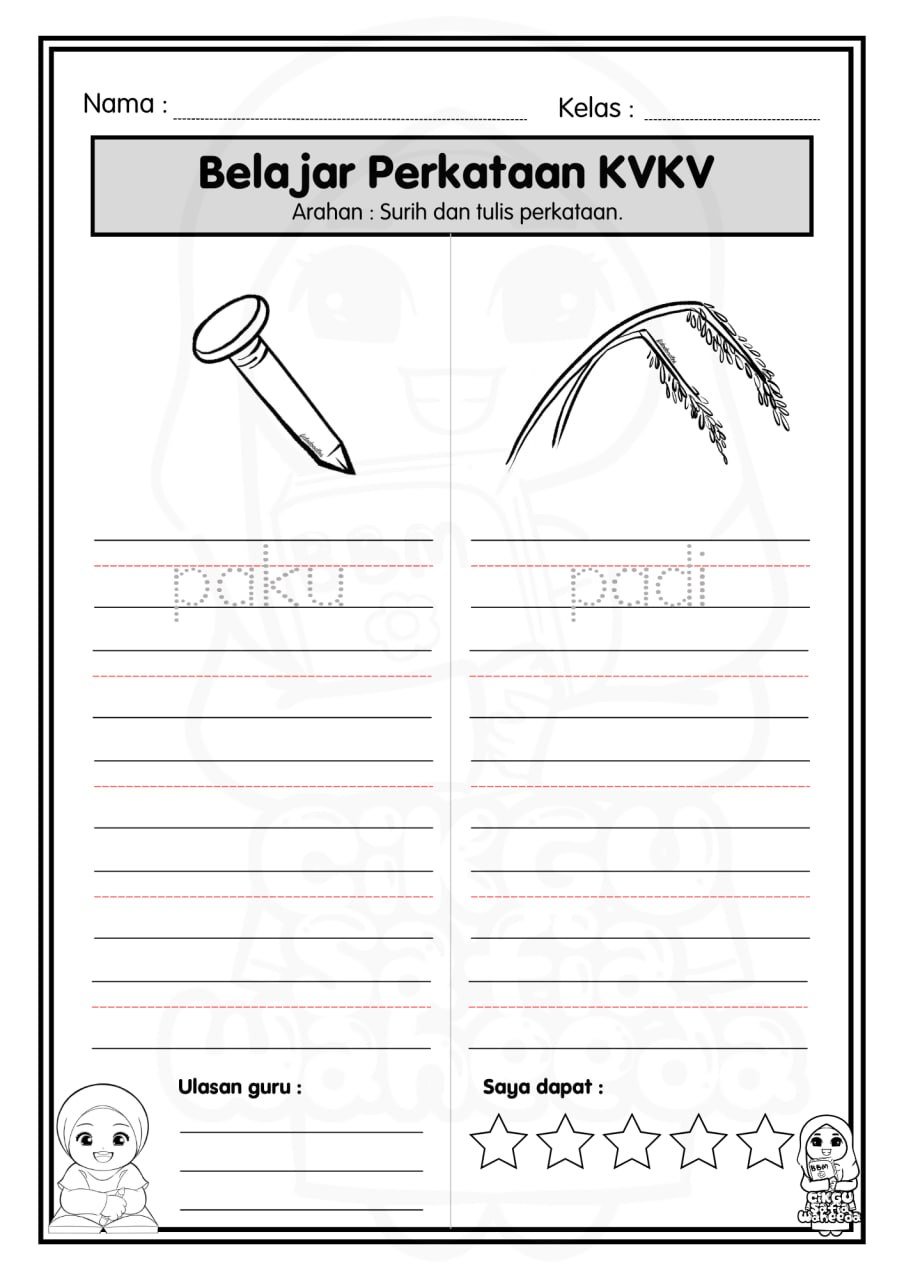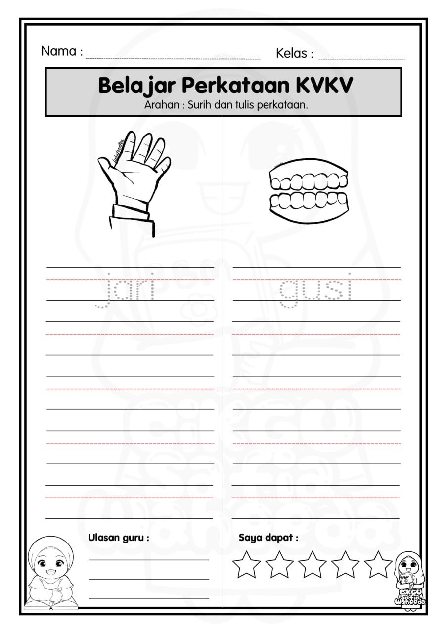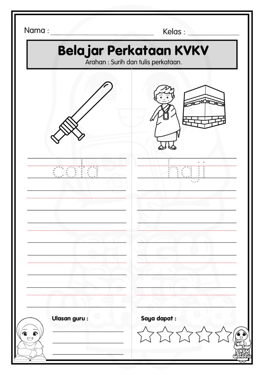 poster lembaran kerja kvkv 55 halaman percuma surih dan tulis bahasa melayu untuk murid prasekolah dan tahun 1