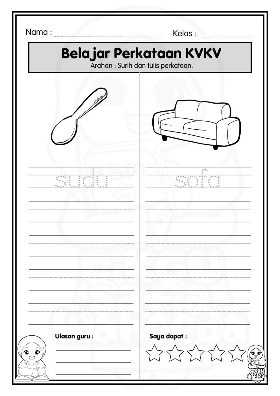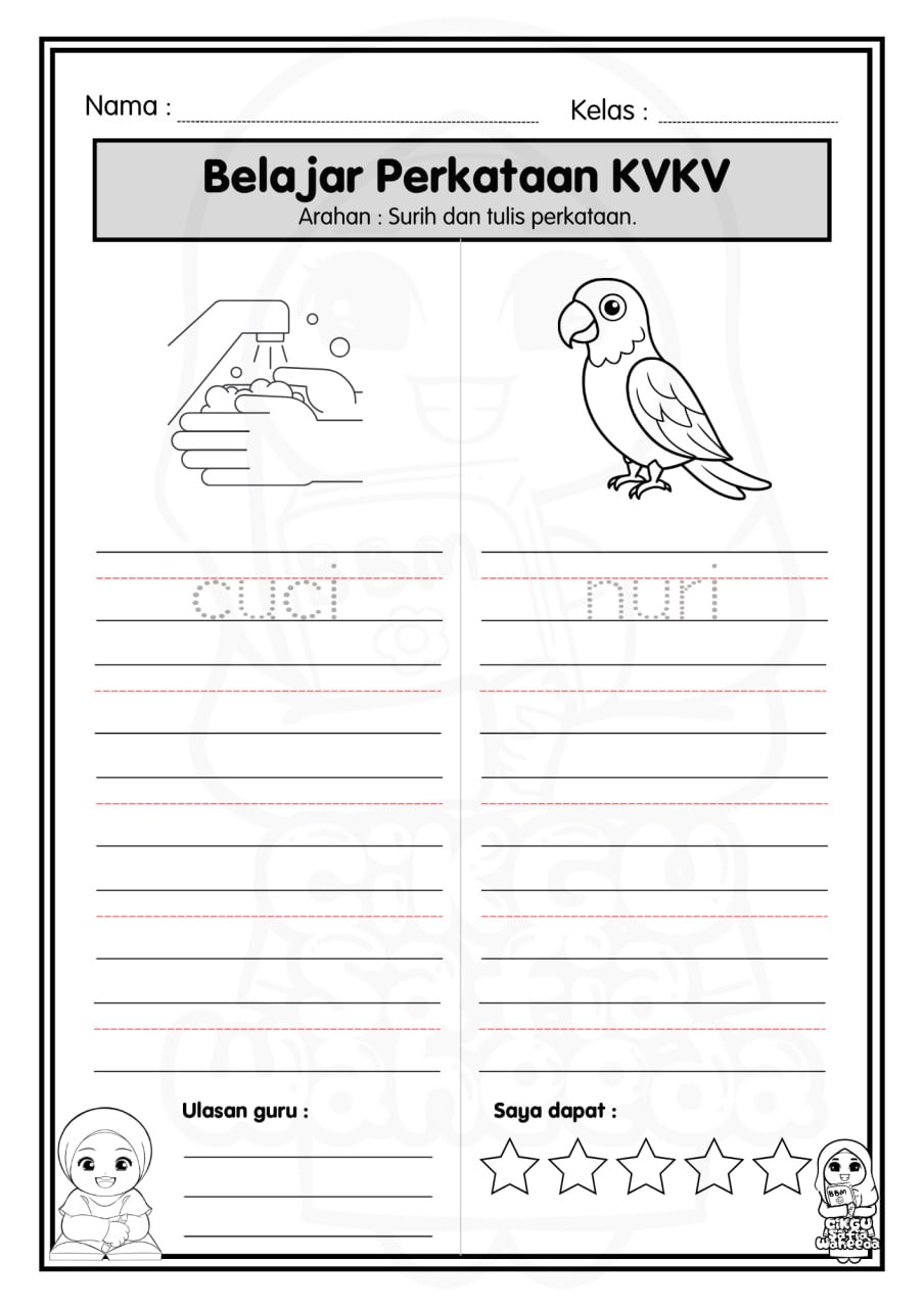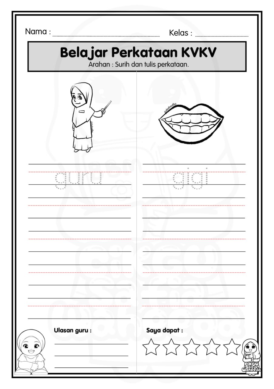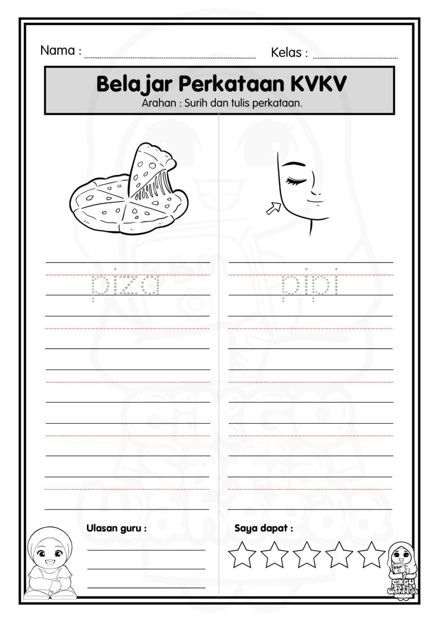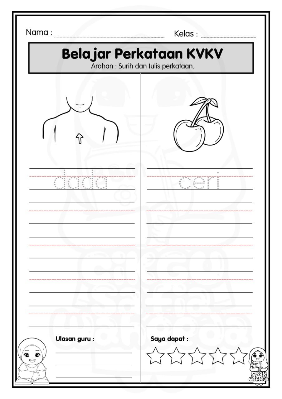 poster lembaran kerja kvkv 55 halaman percuma surih dan tulis bahasa melayu untuk murid prasekolah dan tahun 1