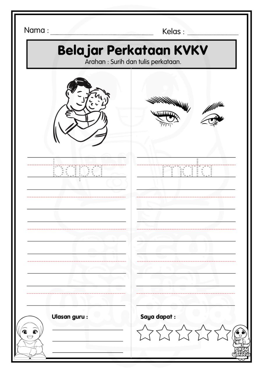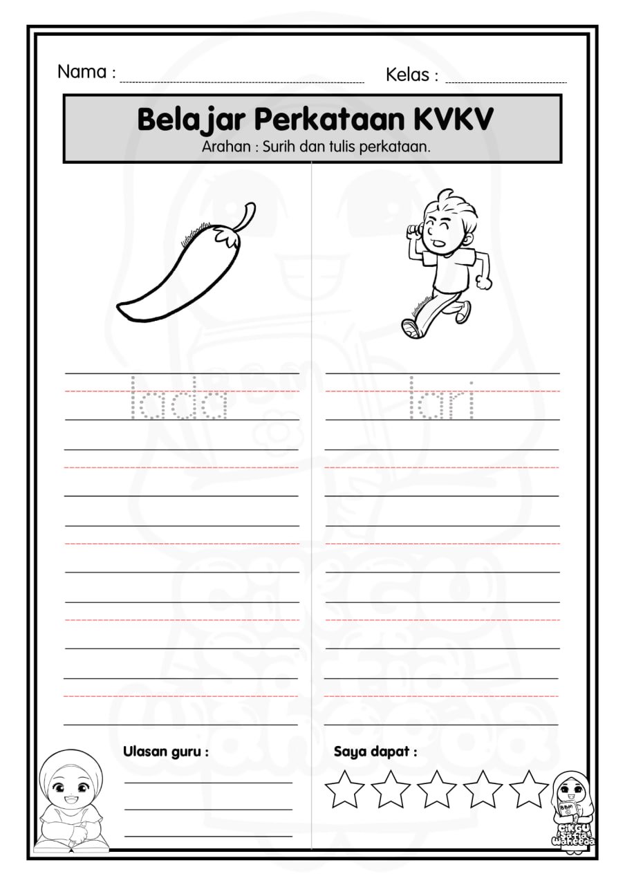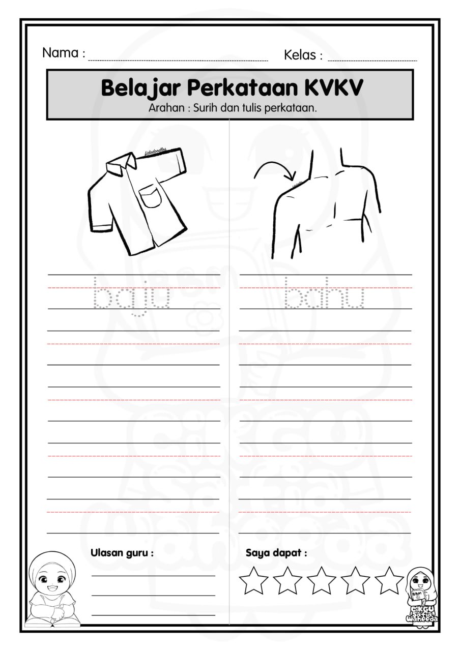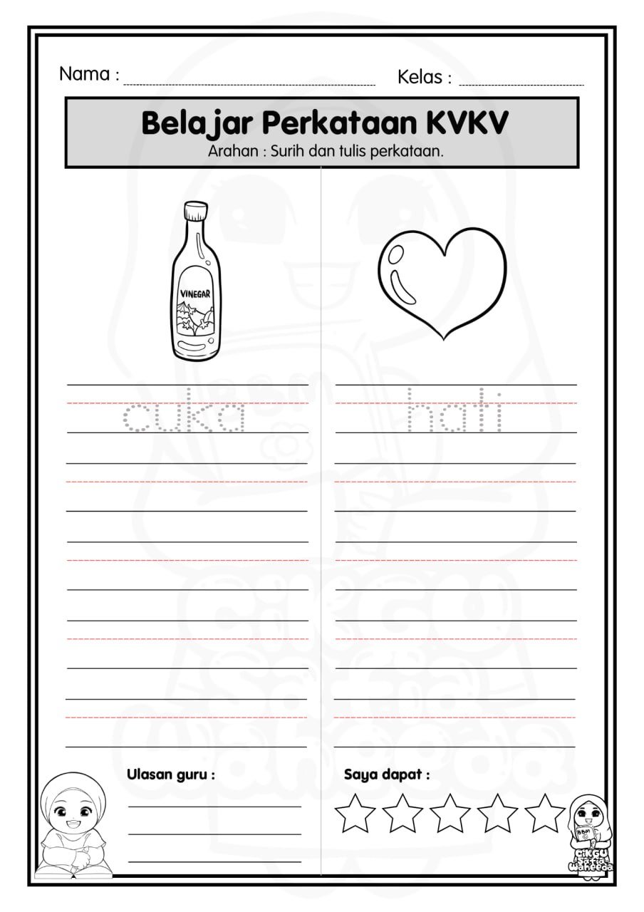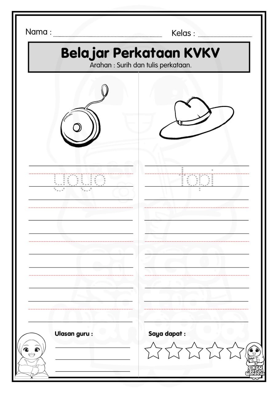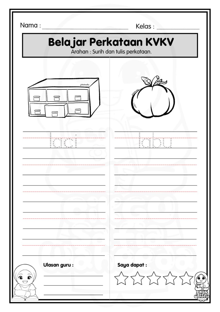 poster lembaran kerja kvkv 55 halaman percuma surih dan tulis bahasa melayu untuk murid prasekolah dan tahun 1
