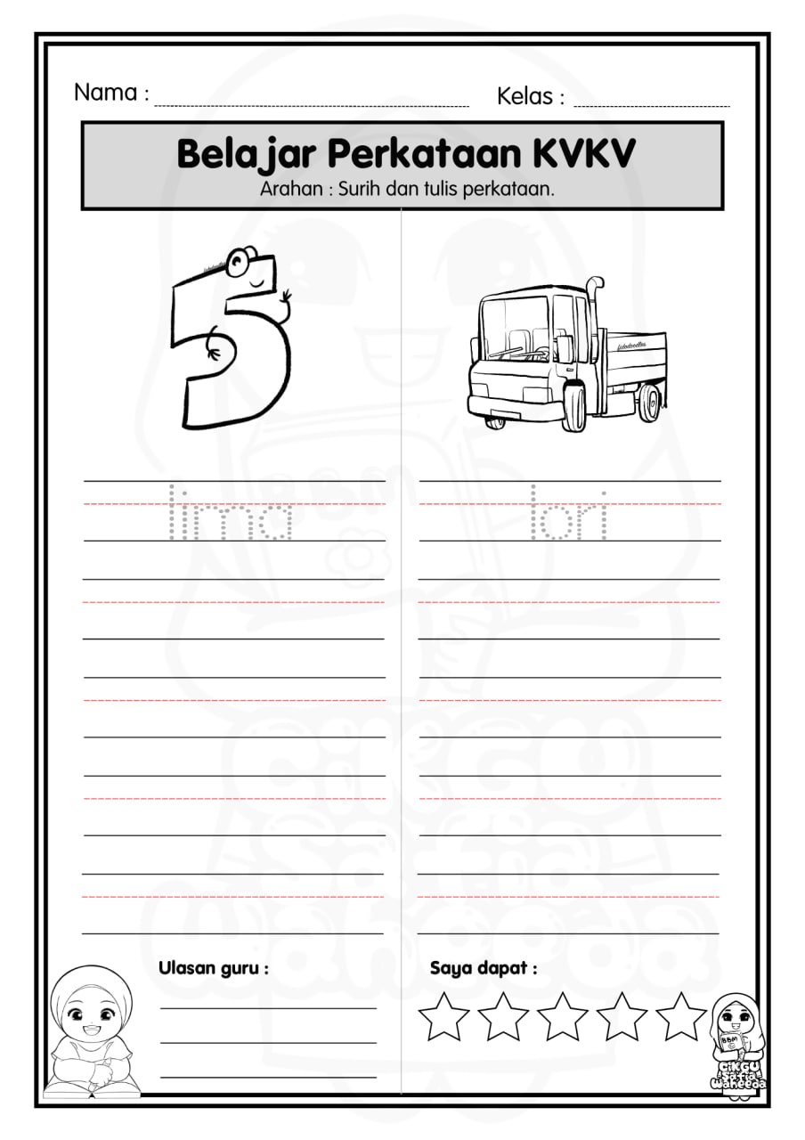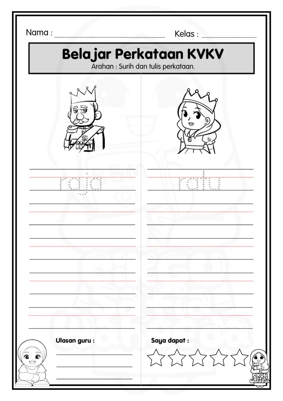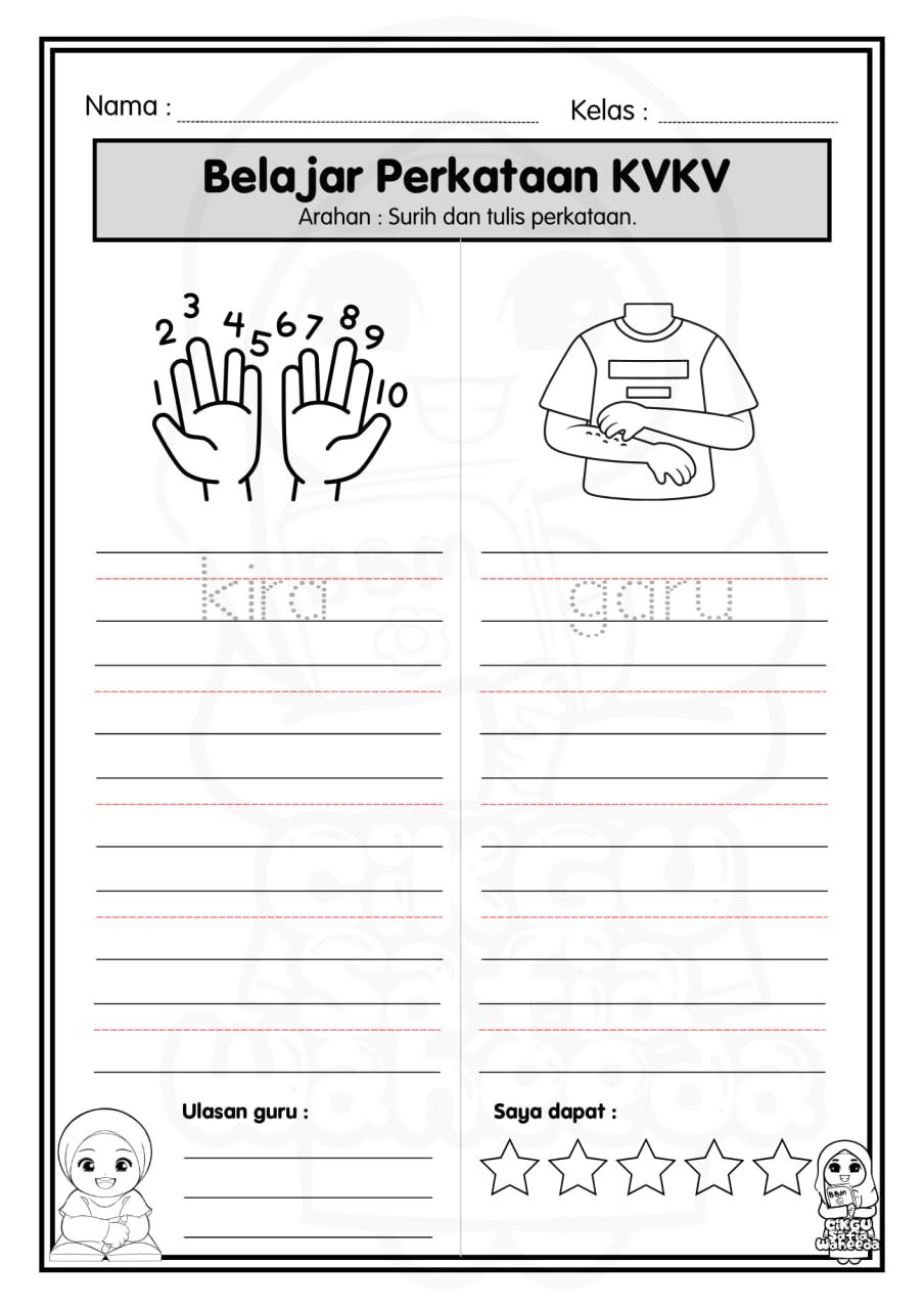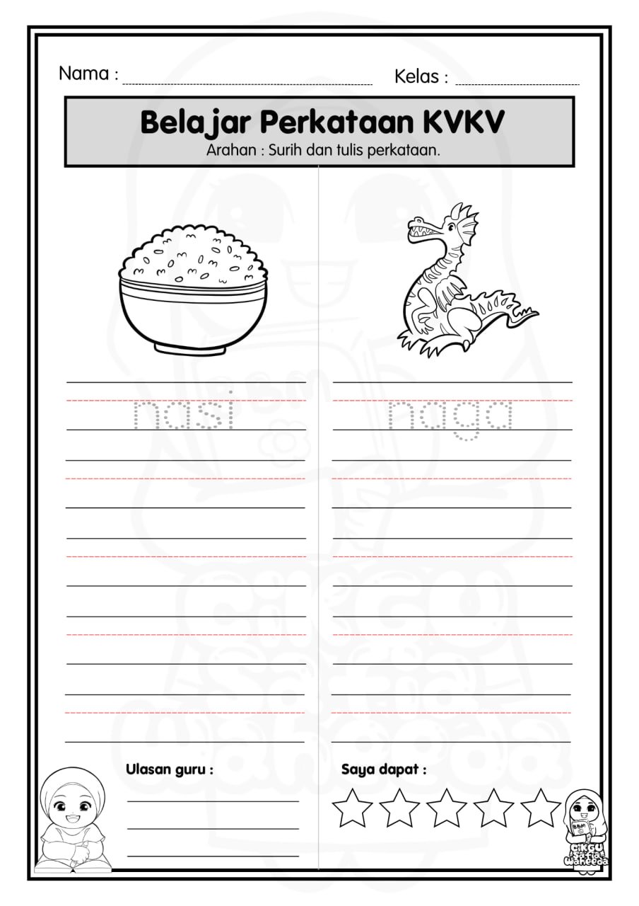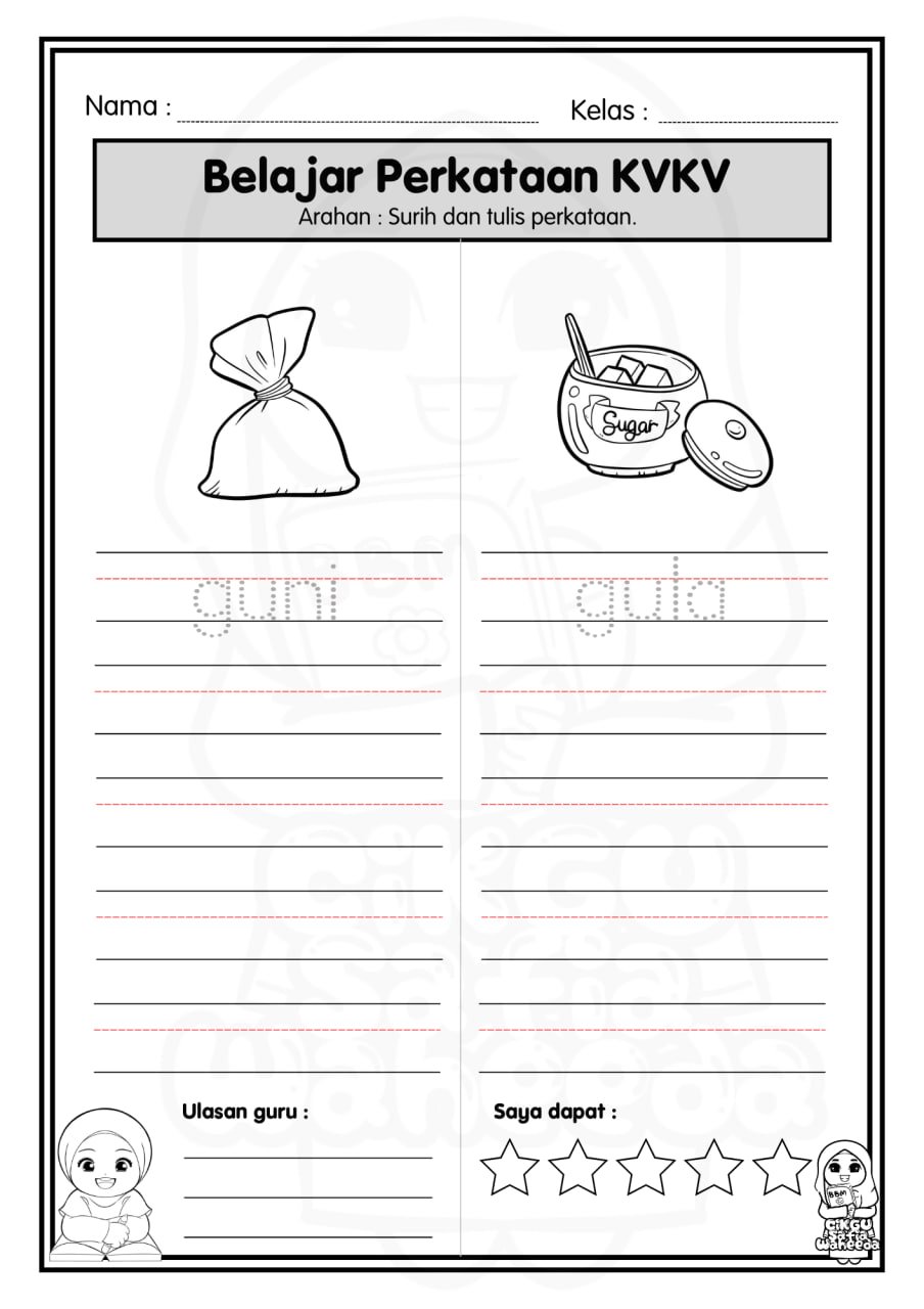 poster lembaran kerja kvkv 55 halaman percuma surih dan tulis bahasa melayu untuk murid prasekolah dan tahun 1