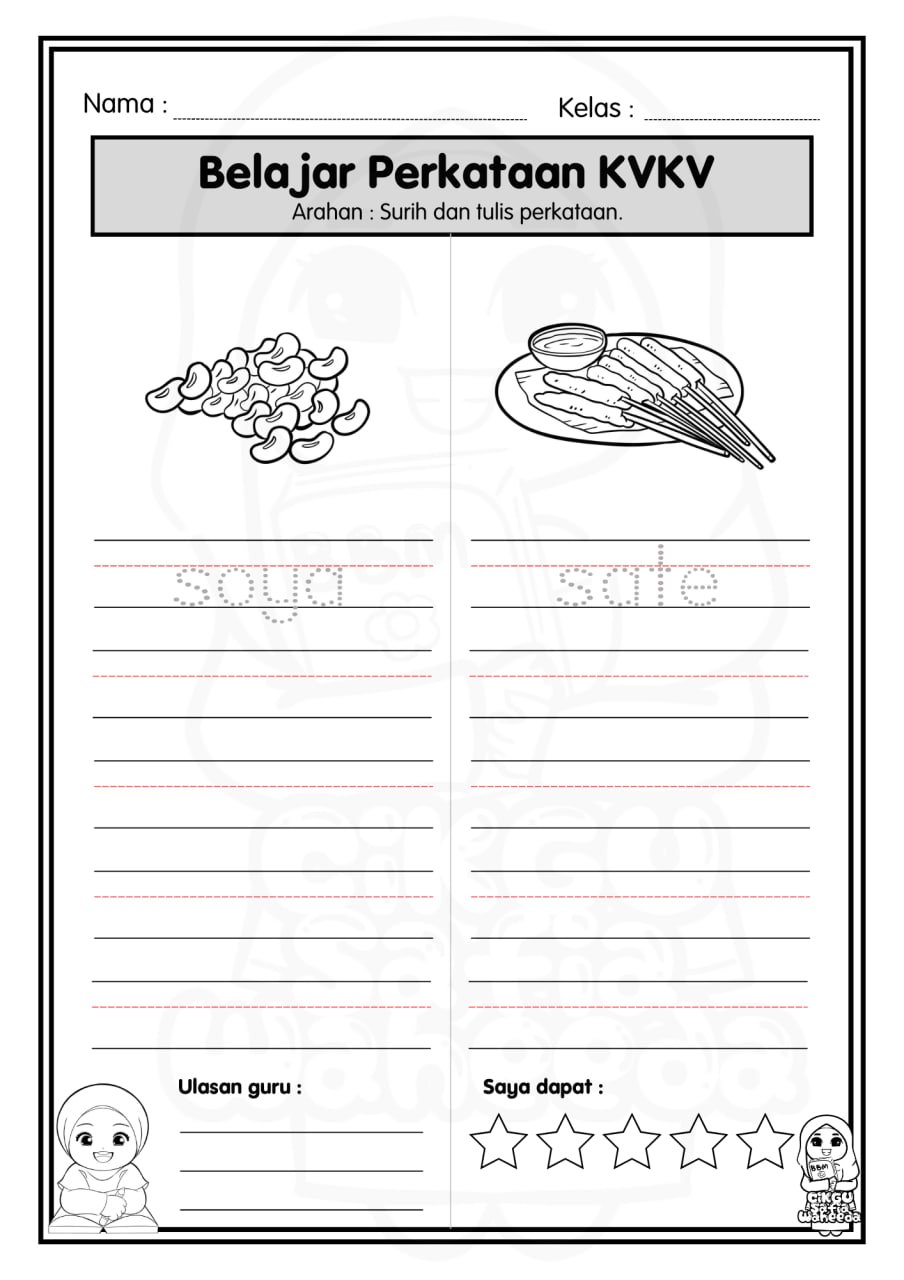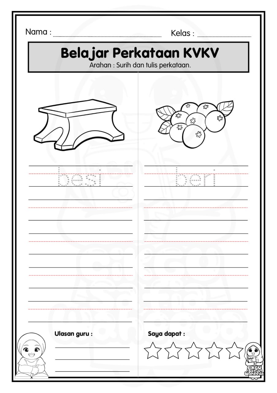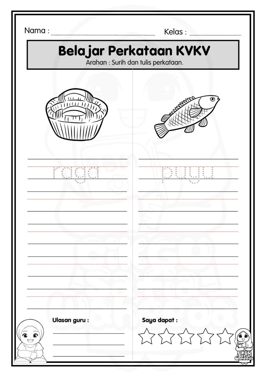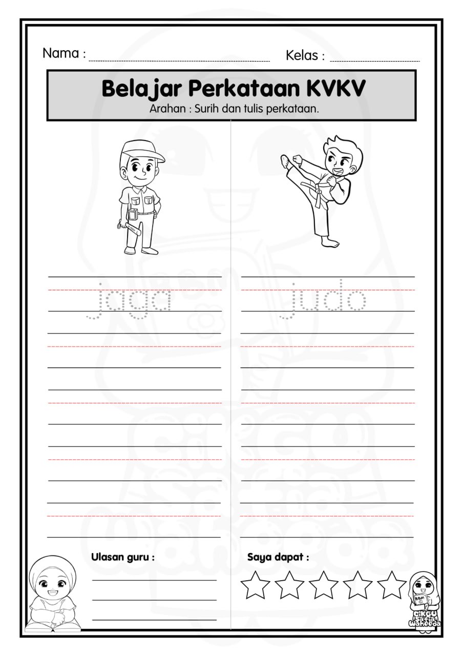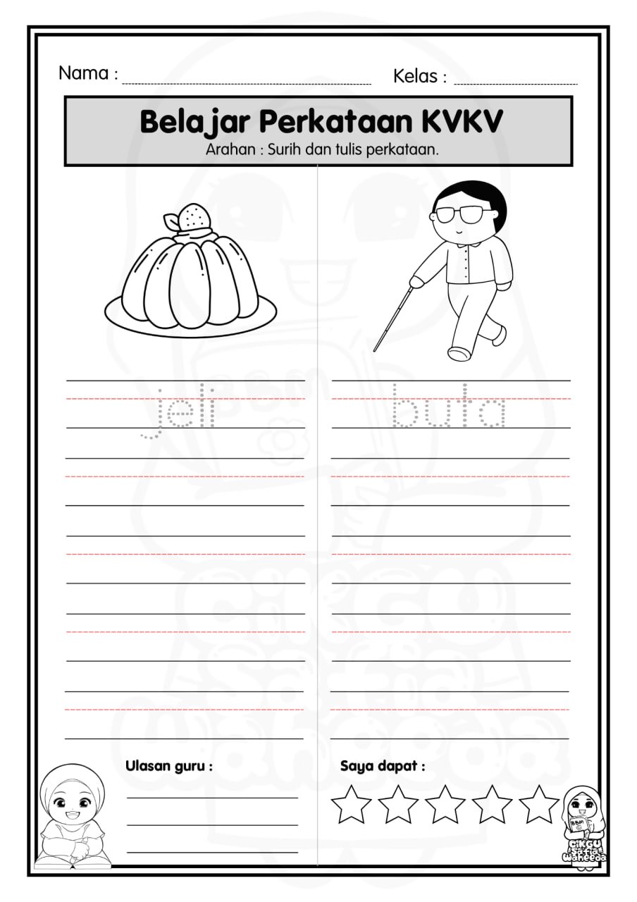poster lembaran kerja kvkv 55 halaman percuma surih dan tulis bahasa melayu untuk murid prasekolah dan tahun 1