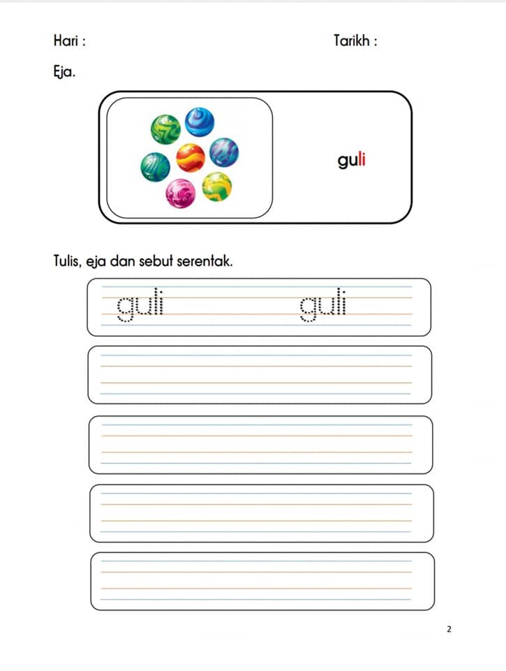 1. Ajar kenal gambar pertama dan sebut perkataan pertama berulang kali dengan sebutan yang jelas dan tulis sambil eja dan sebut secara berulang kali (latih tubi).