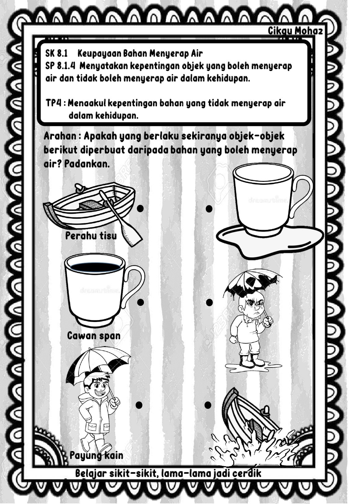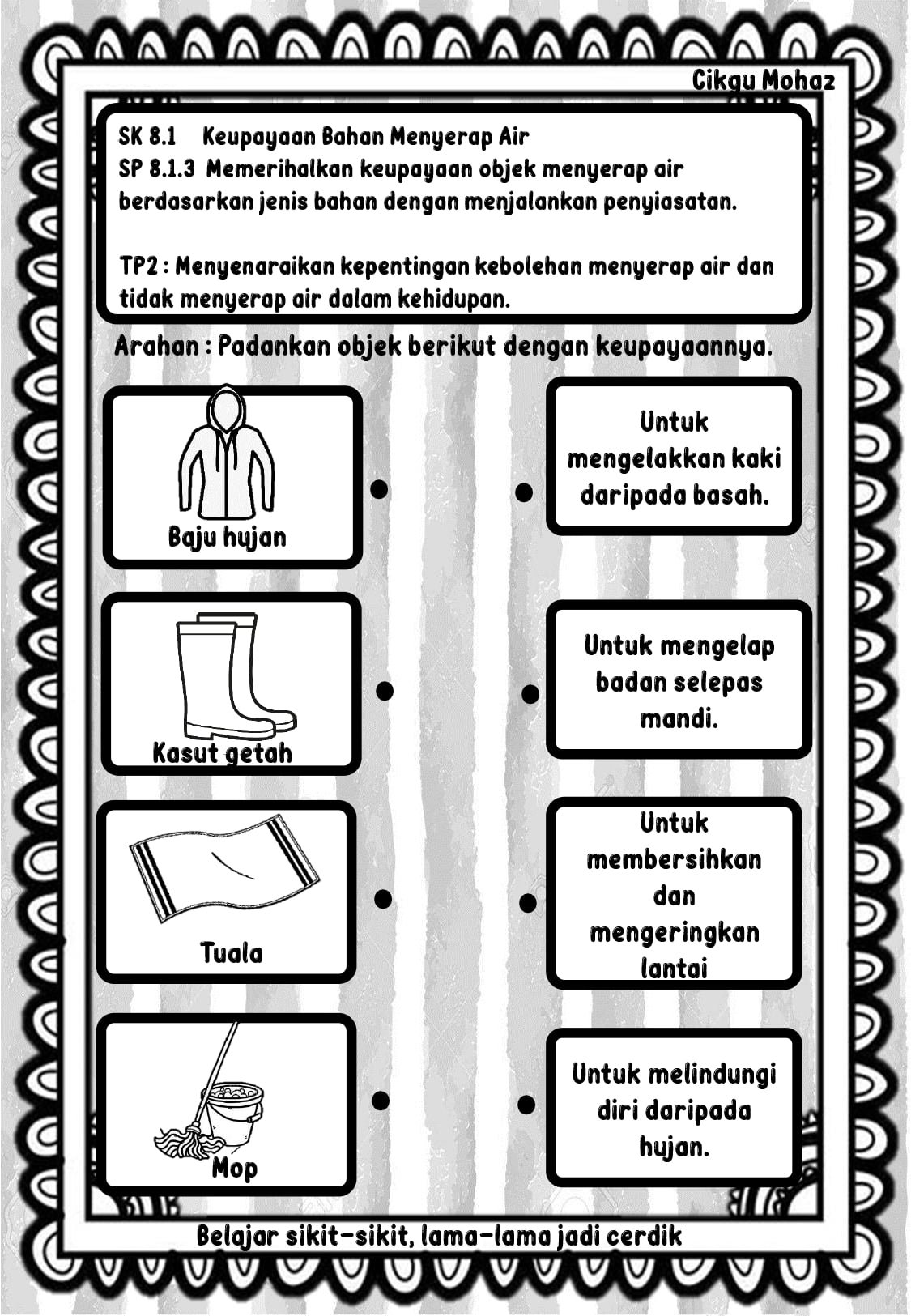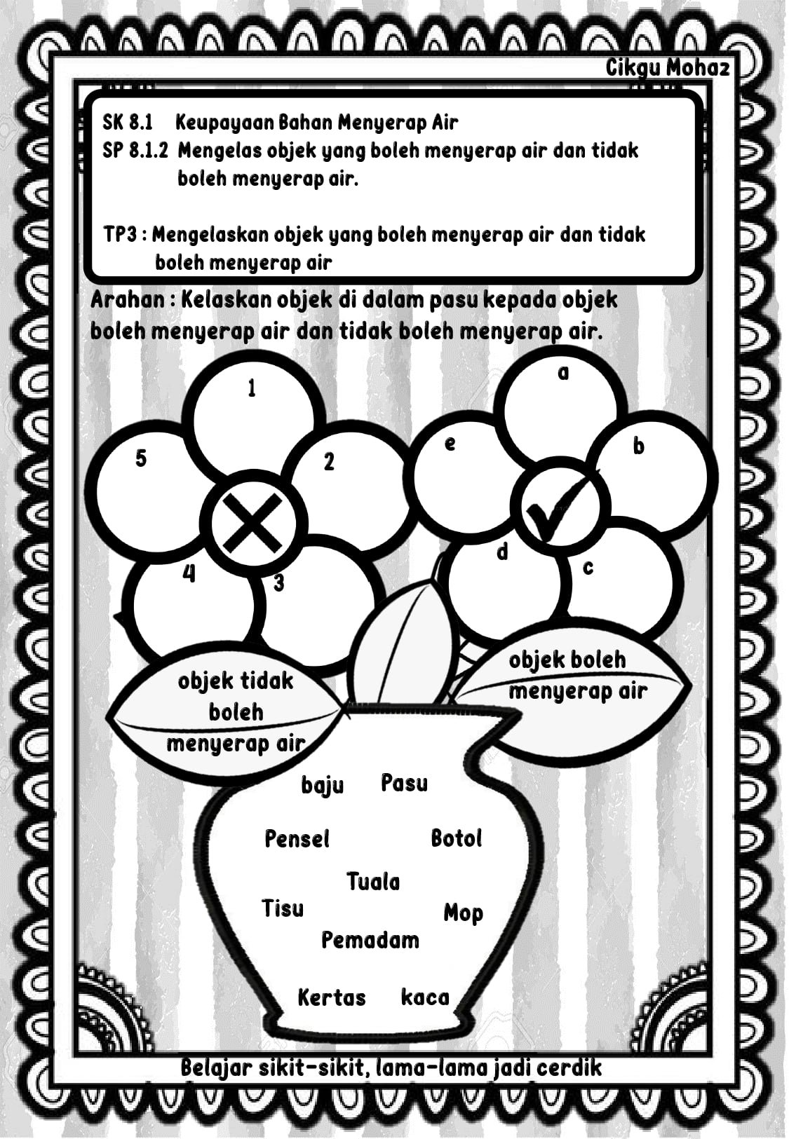 Salam PdPr cikgu. Sains Tahun 1 – Penyerapan. Kali ini, saya buat hitam putih sahaja. Latihan ni sesuai untuk murid aras sederhana dan lemah. Cikgu boleh ambil lembaran kerja dalam bentuk PdF ini di https://mylink.la/cikgu_mohaz . Semoga bermanfaat cikgu. Belajar sikit-sikit, Lama-lama jadi cerdik.