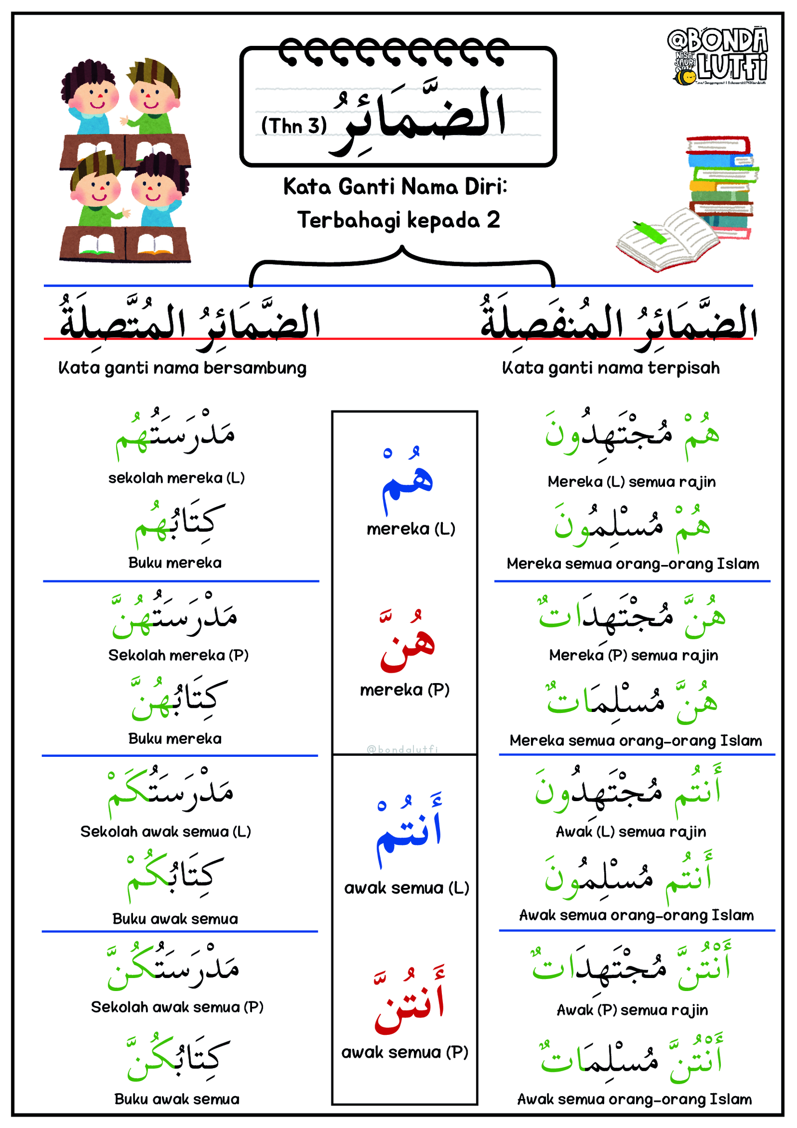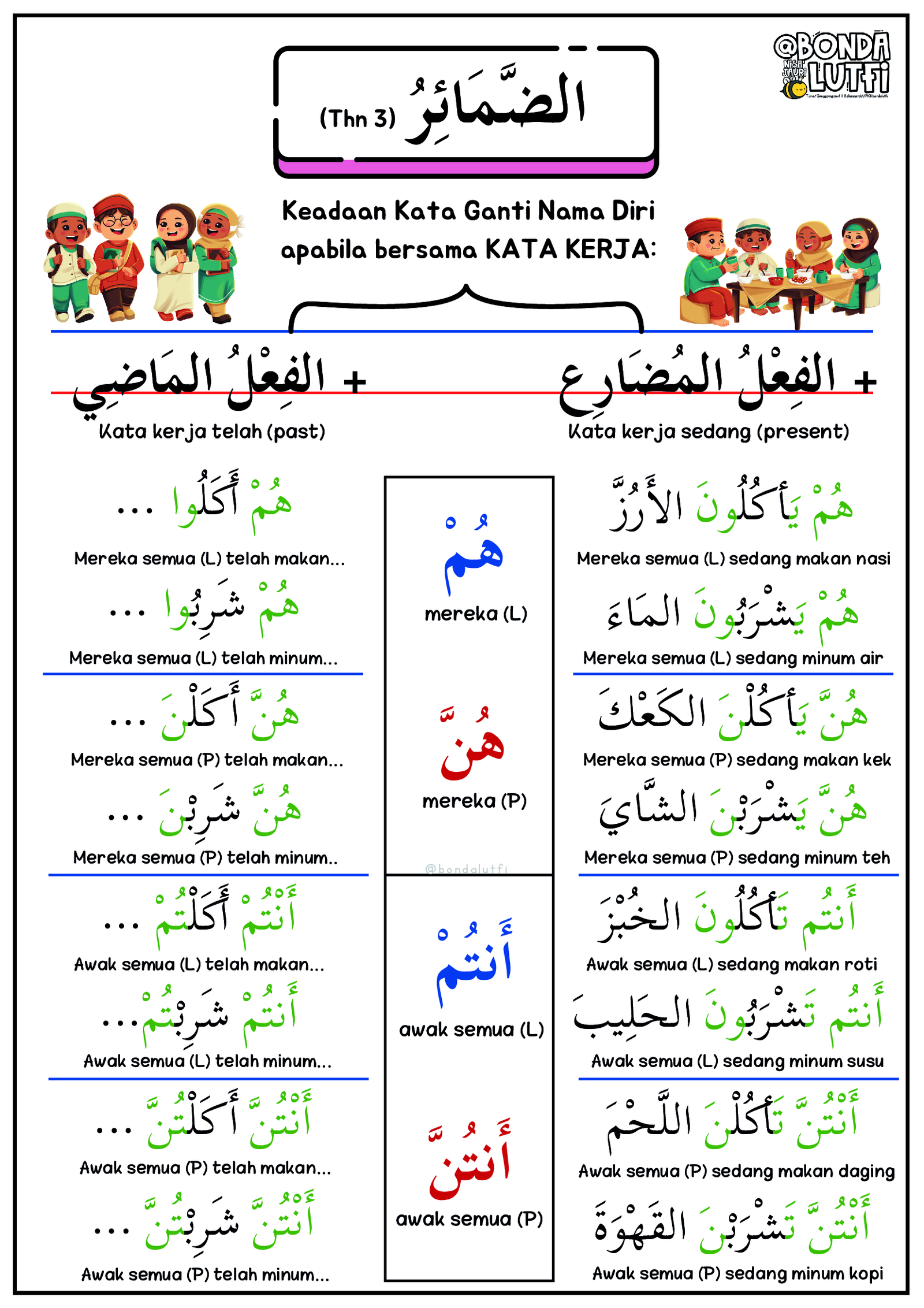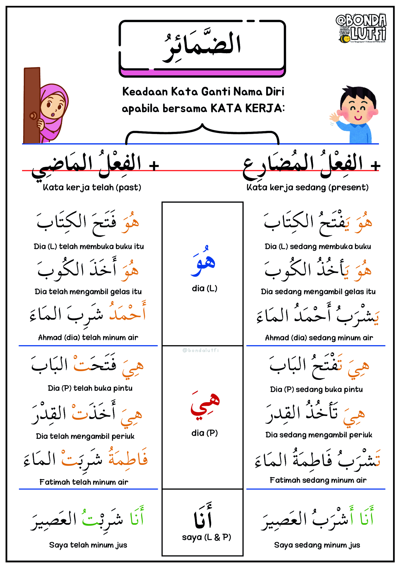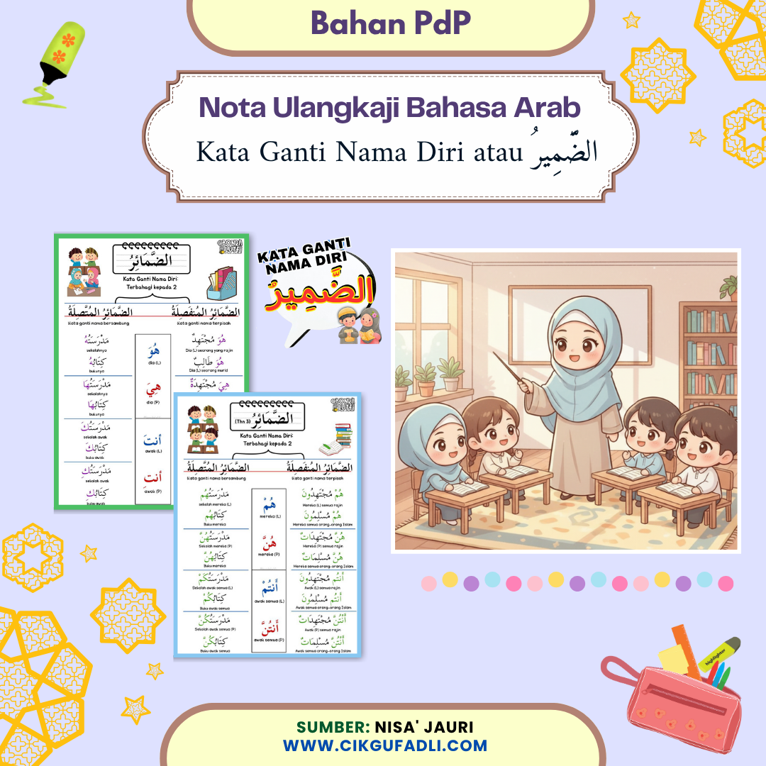 Nota ini boleh dimuat turun dan digunakan untuk sesi ulangkaji di rumah atau di kelas. Cikgu dan ibu bapa boleh cetak untuk bantu anak-anak lebih mudah mengenal dan mengingat Dhamir dengan kaedah visual yang menarik dan kemas.