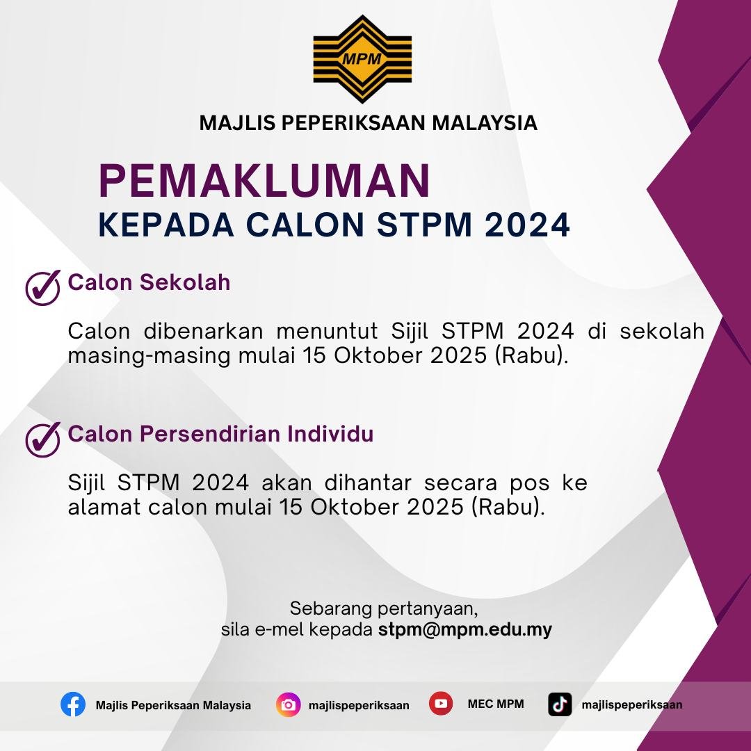 Bagi calon persendirian pula, sijil STPM 2024 akan dihantar secara pos terus ke alamat calon bermula 15 Oktober 2025. Ini bagi memudahkan calon yang tidak berdaftar di sekolah untuk mendapatkan sijil masing-masing tanpa perlu hadir ke mana-mana pusat pengambilan.