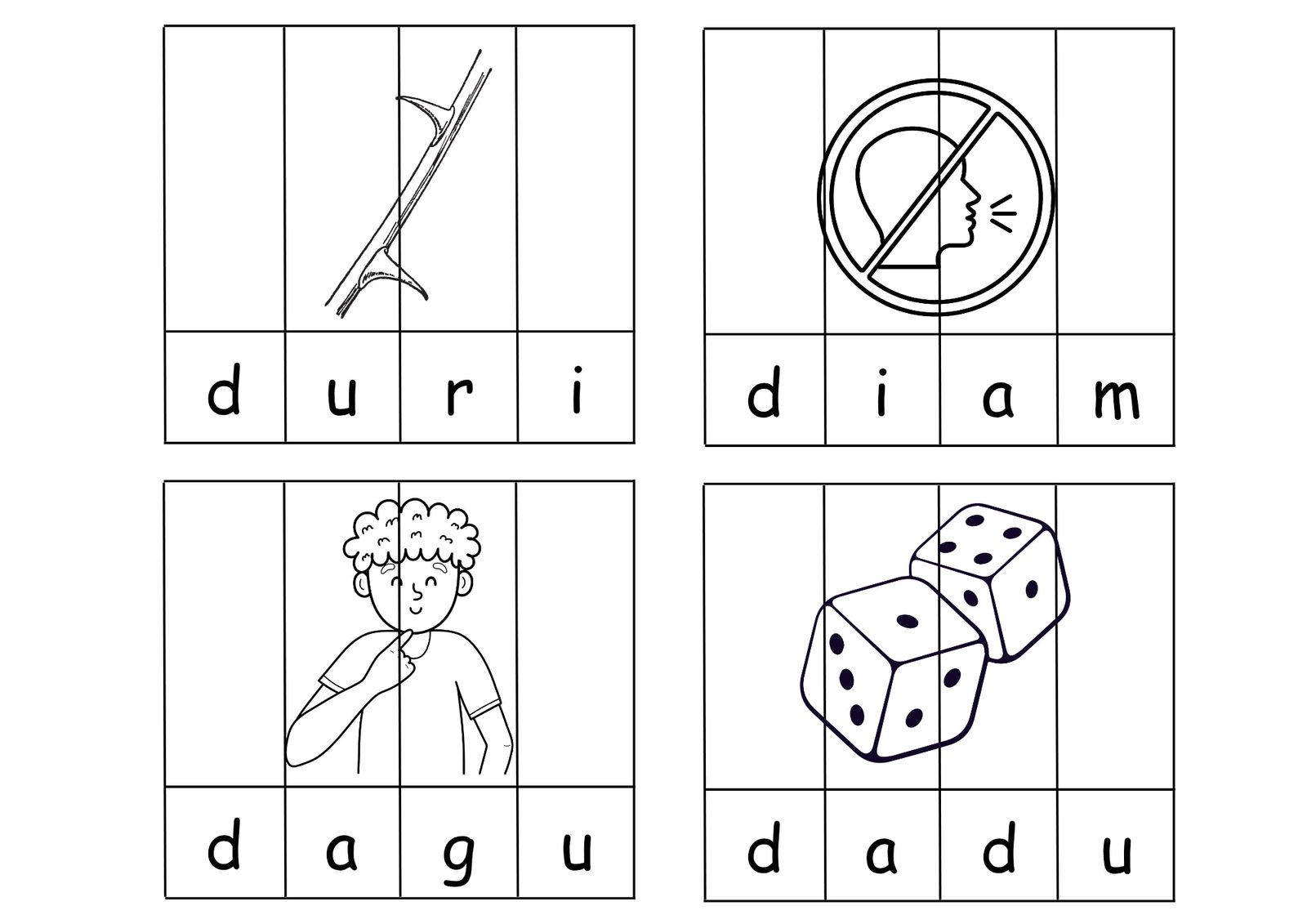 Murid boleh warnakan gambar, potong dan susun puzzle mengikut suku kata atau huruf yang sesuai. Aktiviti ini bukan sahaja menyeronokkan, tetapi juga membantu murid menguasai asas bacaan dengan lebih baik.