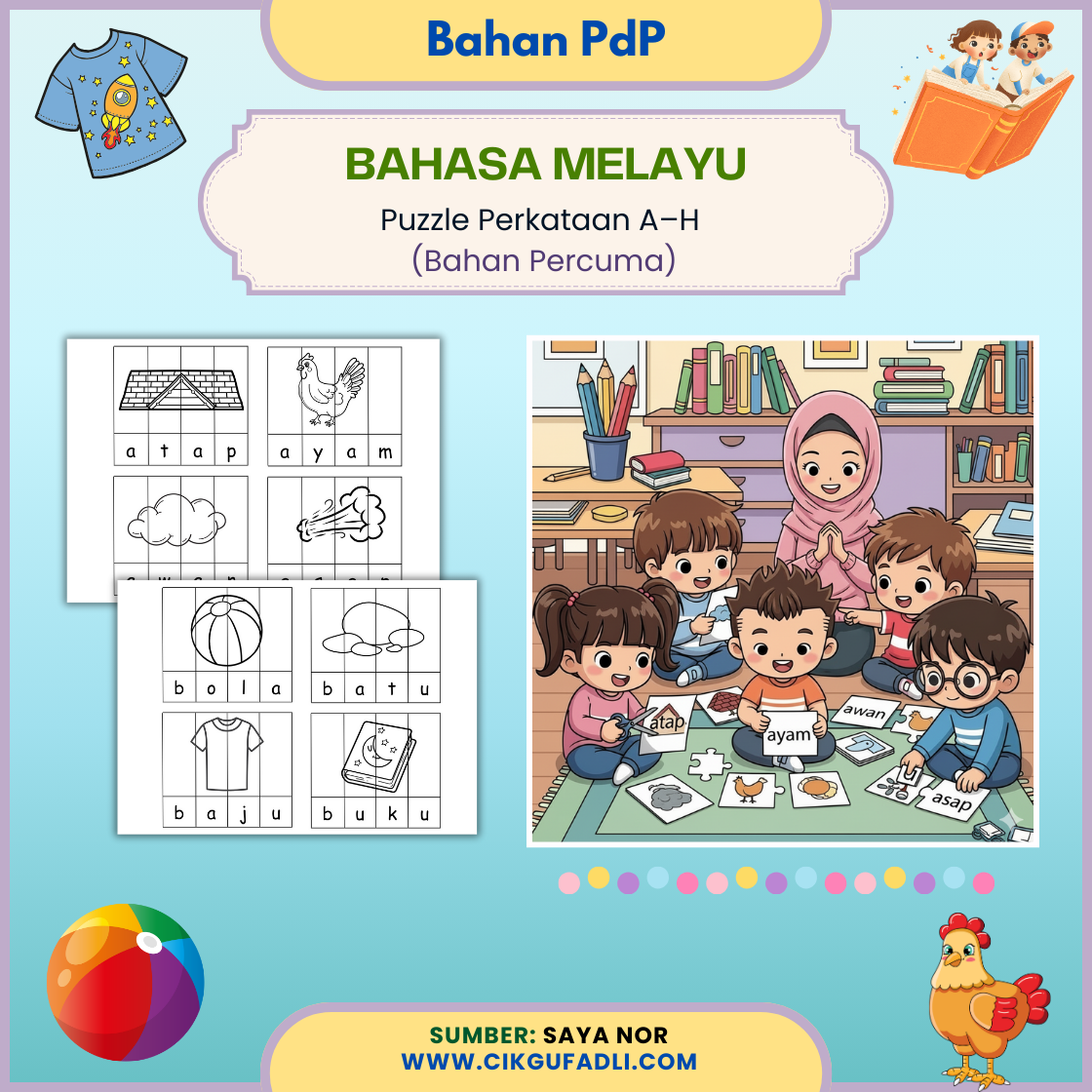 Bahan ini merupakan Puzzle Perkataan (A–H) berbentuk hitam putih dengan ilustrasi mudah dan perkataan asas (contoh: atap, ayam, awan, asap).