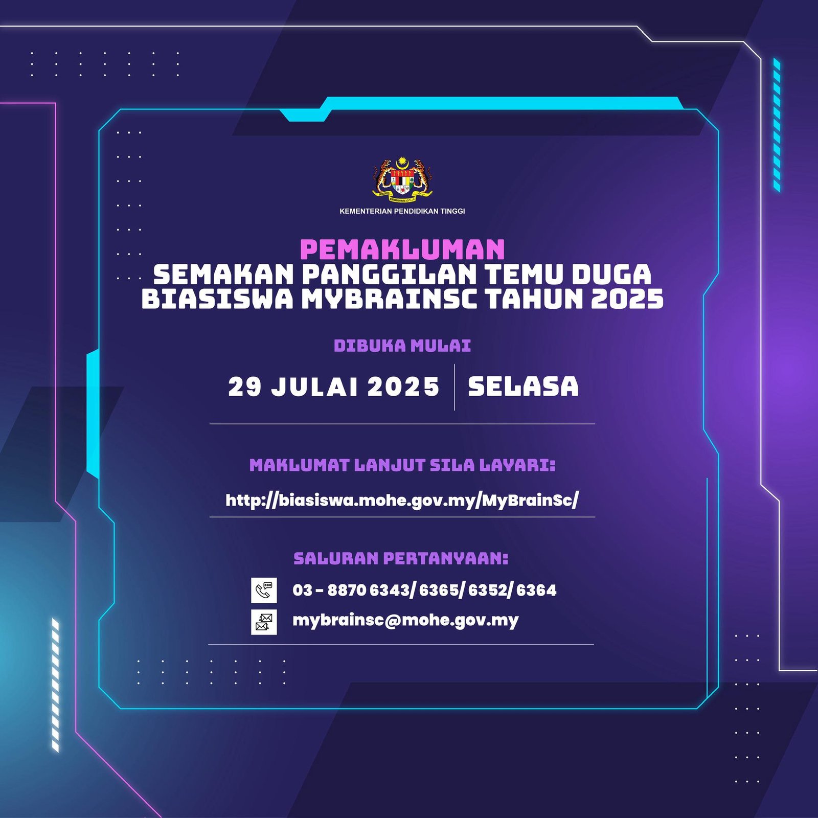 Kementerian Pendidikan Tinggi (KPT) telah mengumumkan bahawa semakan panggilan temu duga bagi Biasiswa MyBrainSc Tahun 2025 akan dibuka mulai: