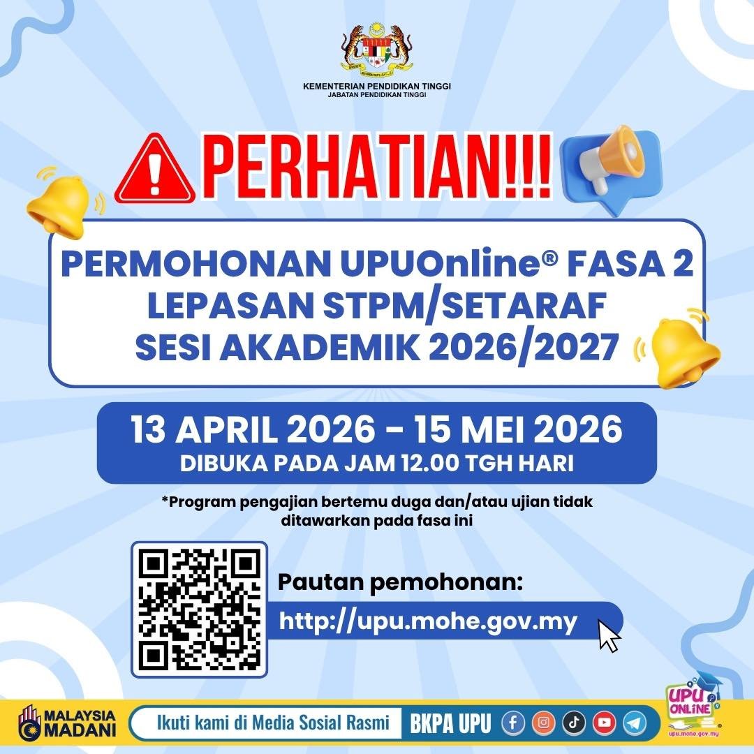 Kementerian Pendidikan Tinggi (KPT) melalui BKPA memaklumkan bahawa permohonan UPUOnline® Fasa 2 bagi sesi akademik 2026/2027 kini dibuka.